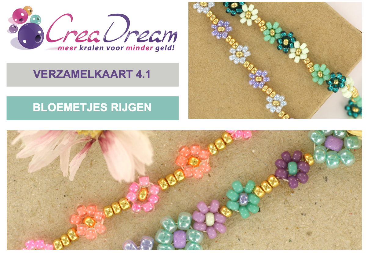Wanneer je de bloemetjes aan wil laten sluiten op elkaar, herhaal je de vorige stappen, maar laat je kraal 1,2,3 weg. Na kraal 7 begin je meteen weer met het aanrijgen van de 1e kraal van je bloem.