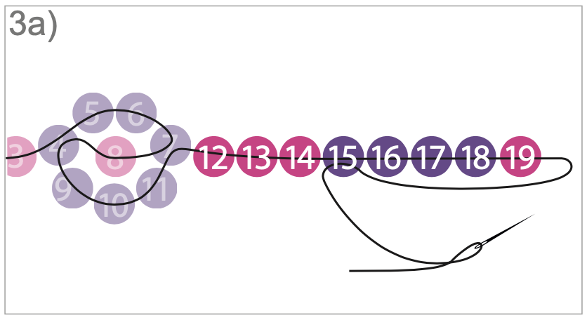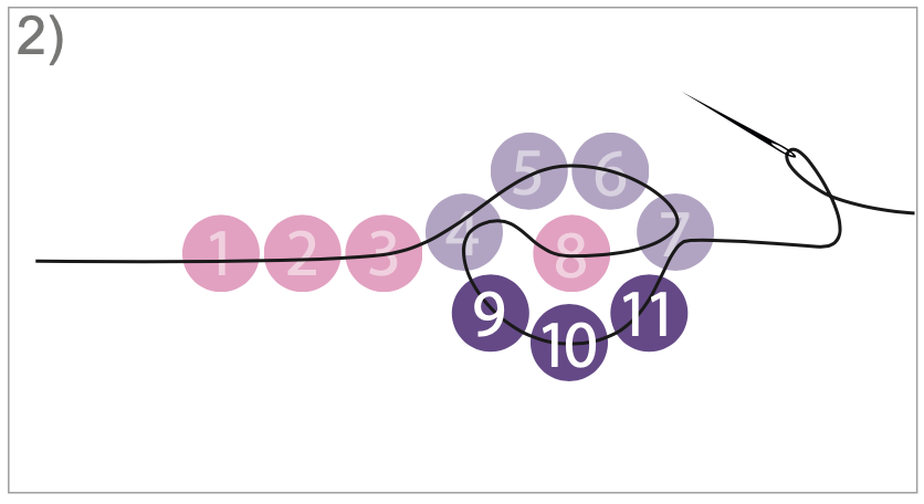 In deze stap maak je de bloem compleet. Rijg 3 kralen van kleur 2 aan je draad. Haal je naald met draad vervolgens door kraal 7. Het is belangrijk dat je dit van links naar rechts doet.