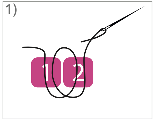 We beginnen met het rijgen van 2 kralen aan de draad. Steek de naald in dezelfde richting door kraal 1 en kraal 2. Als je de draad nu strakker trekt, komen de kralen tegen elkaar aan te liggen.