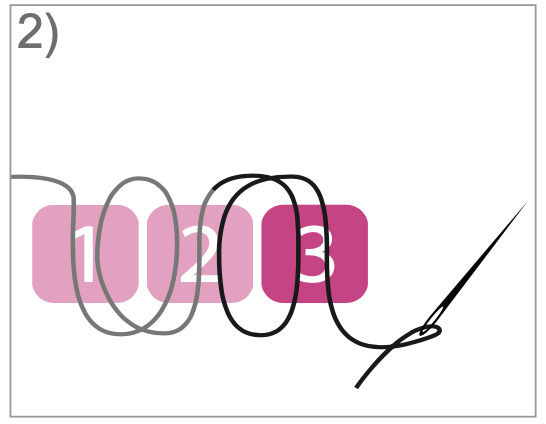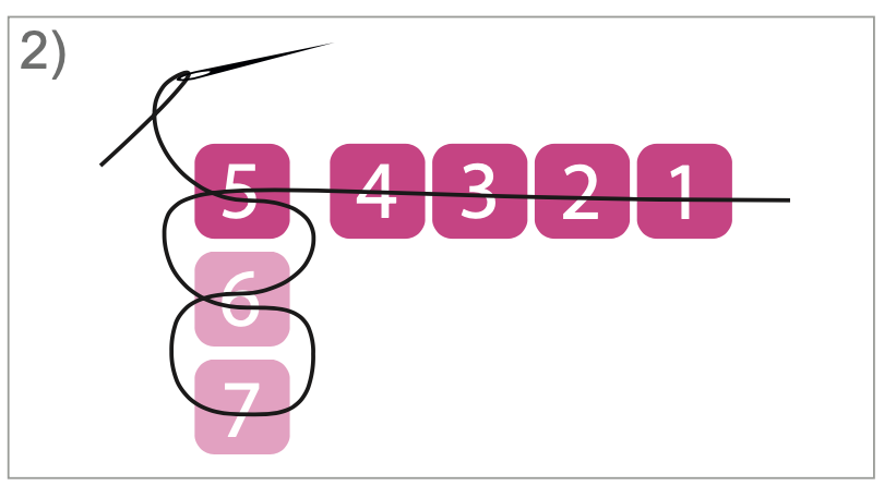 Rijg 3 kralen aan de draad. Steek de naald door kraal 4 t/m 6 en vervolgens door kraal 7 t/m 9.