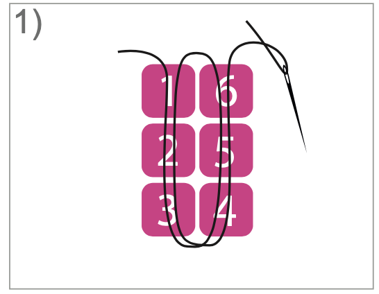 Rijg 6 kralen aan de draad. Steek de naald in dezelfde richting door kraal 1 t/m3 en vervolgens door kraal 4 t/m 6.