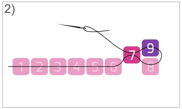 Pak een nieuwe kraal (kraal 9) en rijg deze terug door de voorlaatste kraal (kraal 7) van de vorige rij.