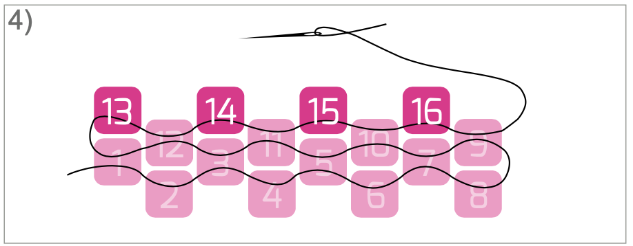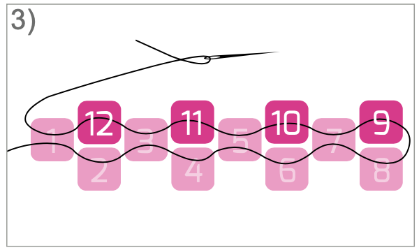 Wanneer je de draad (horizontaal) aantrekt, komt kraal 13 precies boven kraal 1 te liggen.