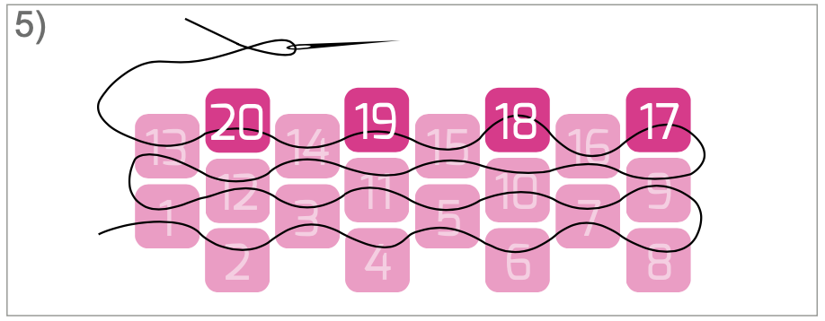 Herhaal deze stap nog twee keer met kraal 11 (bovenop kraal 4) en kraal 12 (bovenop kraal 2) totdat je zo het einde van je rij hebt bereikt.