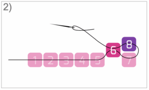 Rijg kraal 8 aan en rijg deze terug door kraal 6. Hierdoor komen kraal 7 en 8 boven elkaar te zitten. Zij vormen samen 1 rijtje. Kraal 6 is alleen een rijtje.