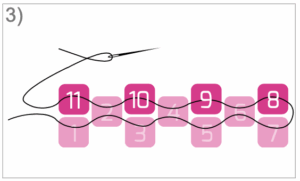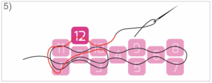 Om de naald en draad op de juiste plek te krijgen om je nieuwe rij te beginnen, rijg je door kraal 10, 2, 11. Nu kan je kraal 12 (de eerste kraal van de nieuwe rij) aanrijgen en deze vastzetten. Hiervoor rijg je door kraal 10.