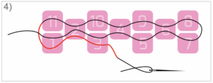 Rijg kraal 9 aan en rijg deze terug door kraal 4. Hierdoor komen kraal 5 en 9 boven elkaar te zitten. Ook zij vormen samen weer een rijtje en kraal 4 is een rijtje alleen.
