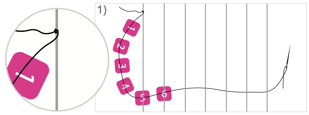 (In dit voorbeeld gebruiken we 6 kralen breed, dus spannen we 7 draden.)