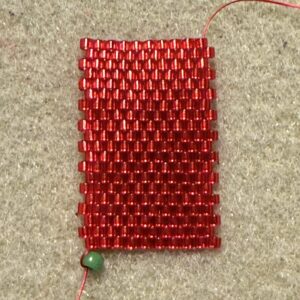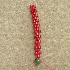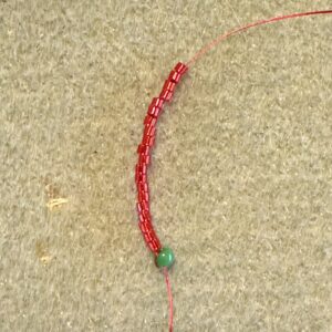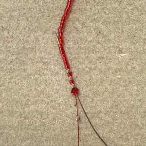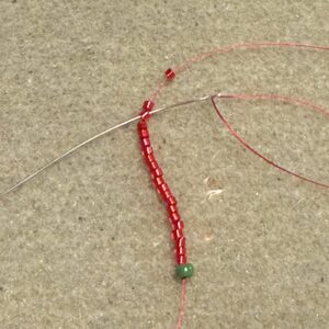 We beginnen met een flink stuk draad, je hebt zeker 1,5 meter nodig. Mocht je dit niet fijn vinden met rijgen, kun je ook eerst het matje maken er hierna de fringe met een andere draad eraan bevestigen. Ik vind het zelf altijd fijn om de draad dubbel te pakken en dan de naald steeds een stukje op te schuiven. Ik heb eerst een stopkraal opgeregen, dit is een grotere kraal waar ik een keer doorheen ga, zodat de kraaltjes niet van de draad afschuiven. We beginnen met 20 rode delica’s op te rijgen, daarna rijg je 1 kraaltje en steekt de naald terug door de 2e kraal die je al opgeregen had. De kraaltjes komen nu naast elkaar te liggen.