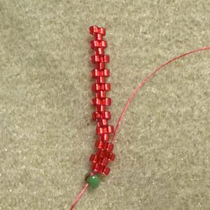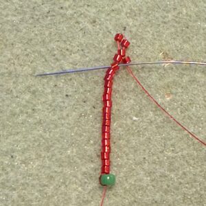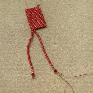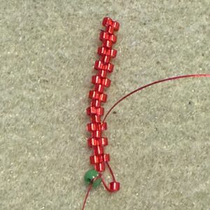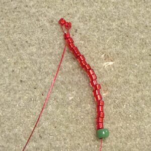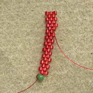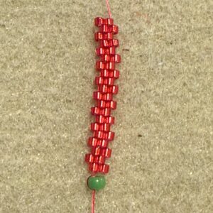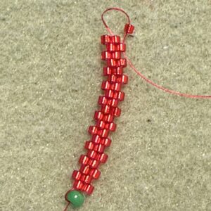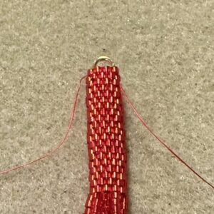 Rijg 30 rode delica’s, daarna een gouden, een rode, een gouden, een rode en een gouden. Vervolgens een preciosa bicone en als laatste een gouden delica. We slaan de laatste delica over en gaan met de naald terug door alle kralen omhoog. Ga door de eerste kraal van het matje en ga vervolgens door de kraal die ernaast ligt weer naar beneden.