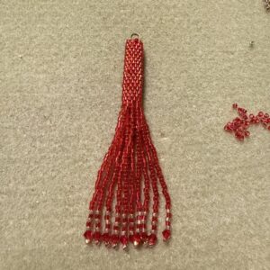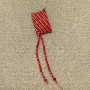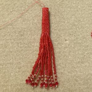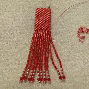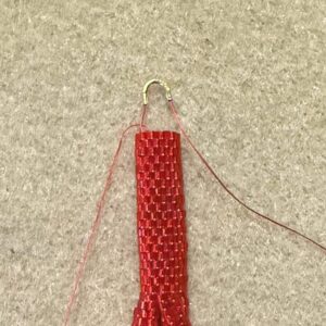 Nu kun je beginnen aan je 2e fringe, rijg weer 30 rode delica’s, een gouden, een rode, een gouden, een rode en een gouden. 1 preciosa bicone en een gouden delica. Sla een delica over en rijg terug door alle kralen naar boven. Ga door de eerste kraal van het matje en door de kraal ernaast naar beneden.