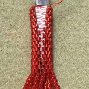 Maak zo het hele rijtje af. Nu gaan we het matje zippen. Zoals je ziet kom je perfect uit en passen de kralen ook perfect in elkaar net als een rits. Je maakt van het matje dus een cilinder en gaat met je draad door de volgende kraal aan de andere kant als waar je uitkwam. Nu ga je weer naar de andere kant en zo rijg je naar boven. Je blijft heen en weer gaan tot je boven bent. (de schaar hoort niet in de oorbel, maar dit was beter voor de foto. Rood op rood zag je helaas niet.) Trek nu rustig de draad aan en het matje sluit zich van zelf tot een cilinder.