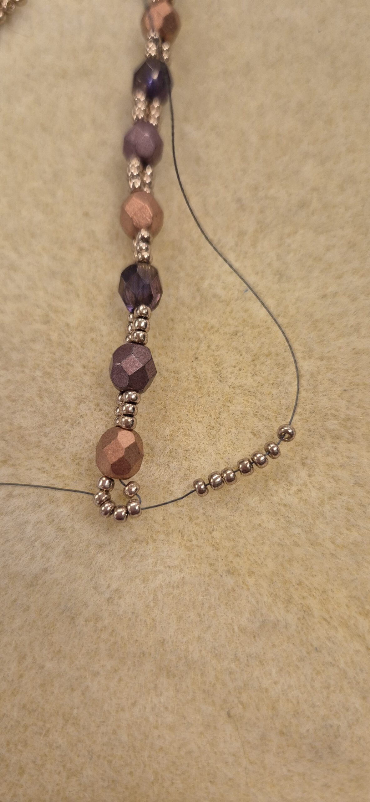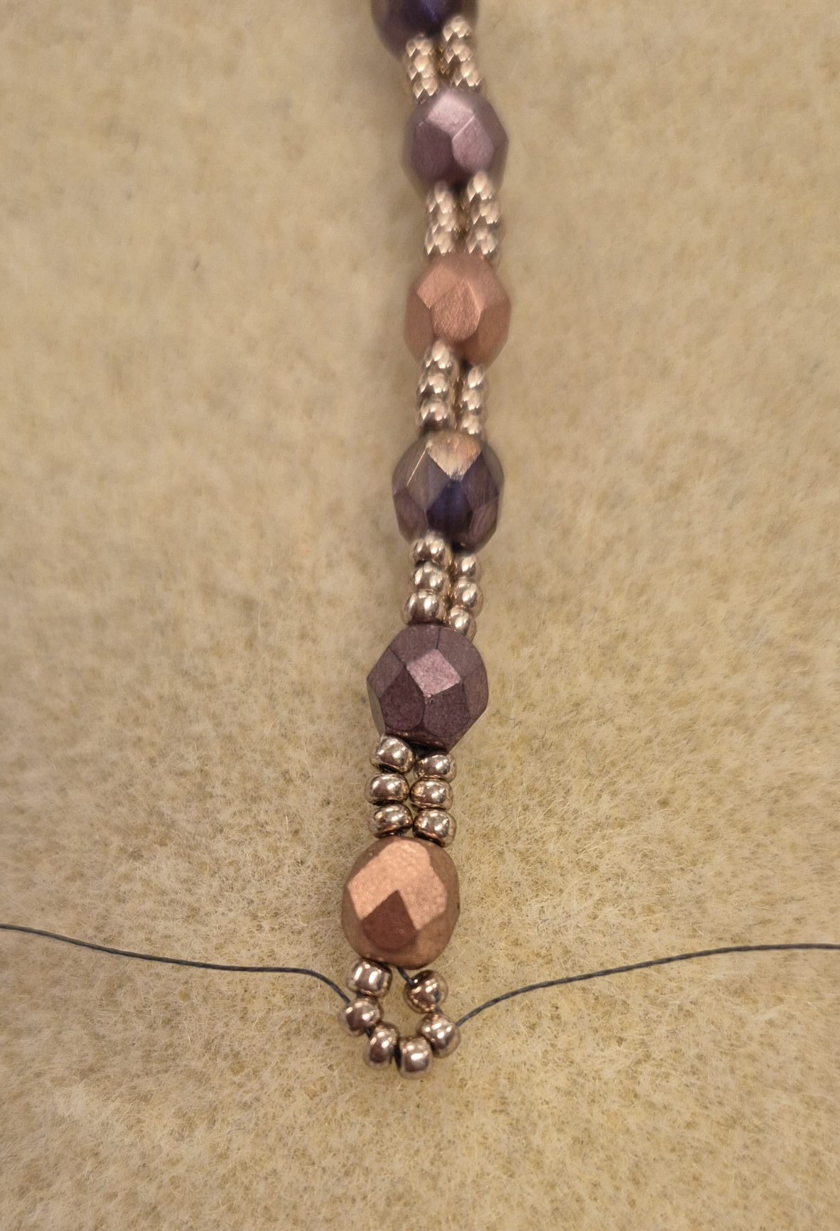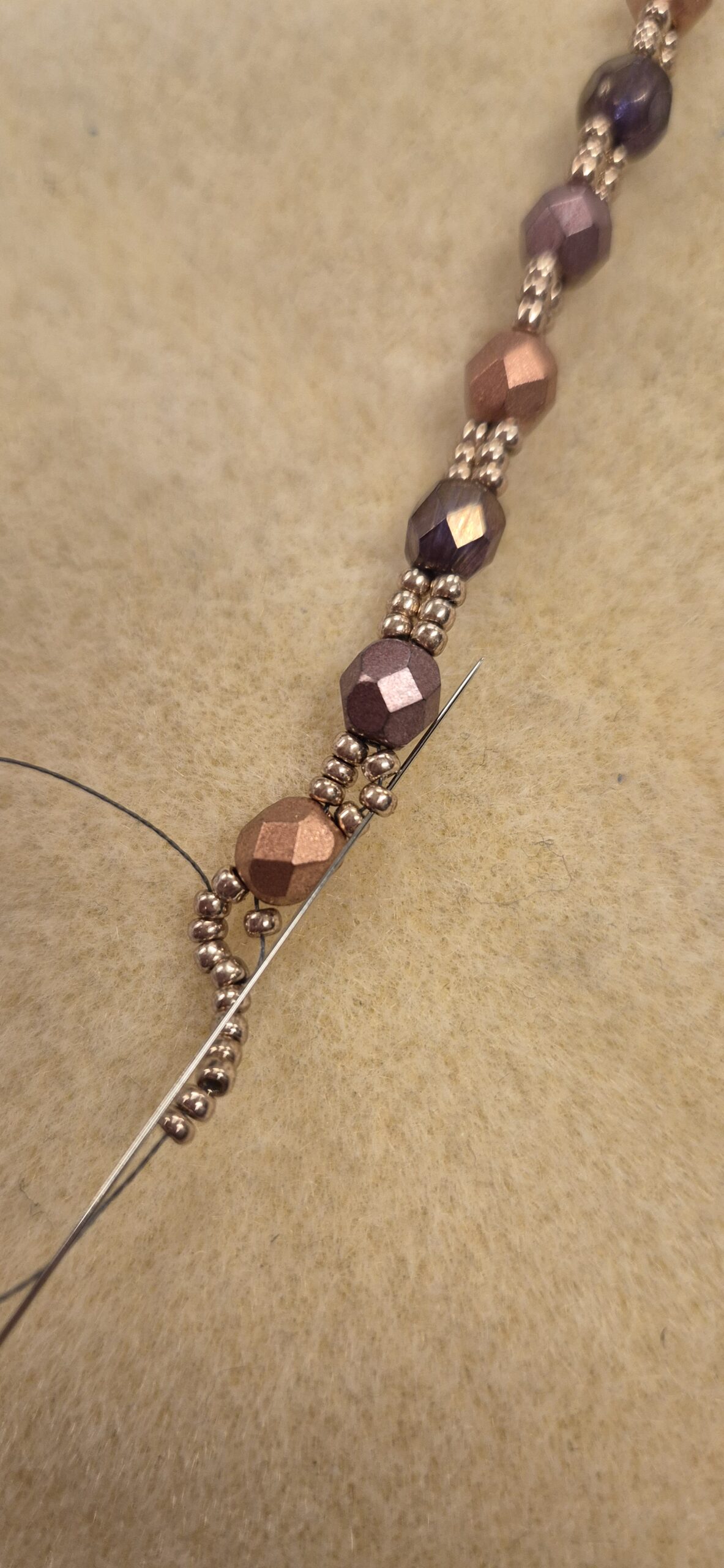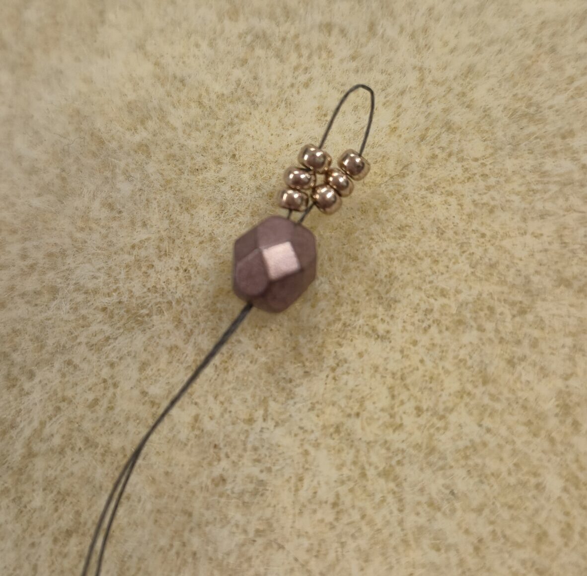 Neem nu de andere draad, want we gaan eerst verder met de andere zijde. Rijg 6 rocailles en plaats ze tussen de eerste en tweede facet door de middelste rocaille, net zoals je aan de andere kant hebt gedaan. Ga door met dit patroon totdat je niet verder kunt.