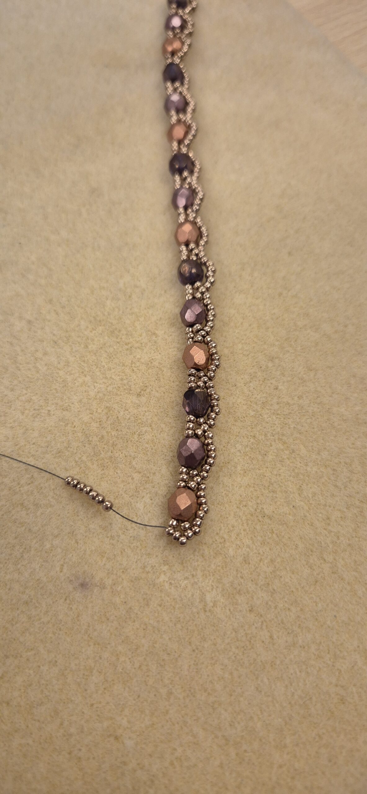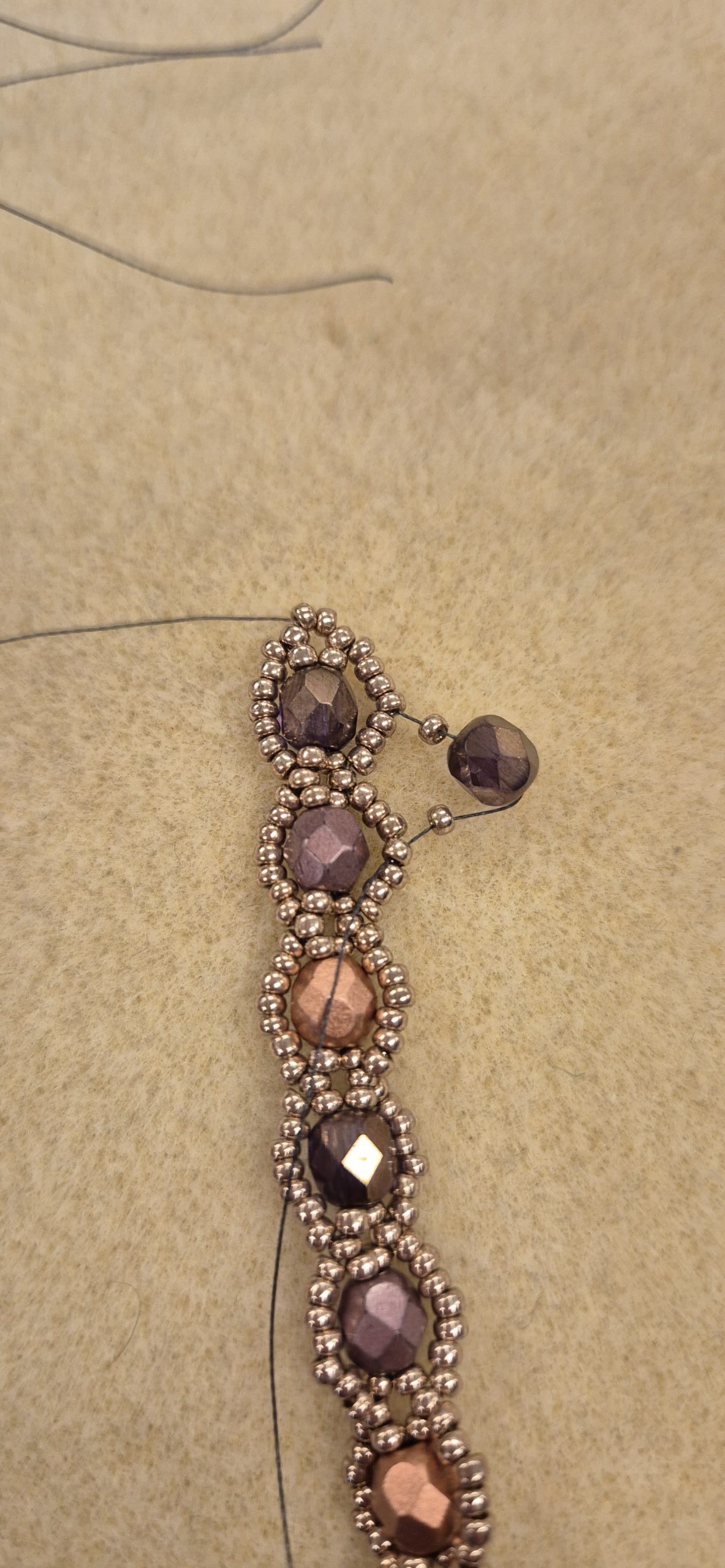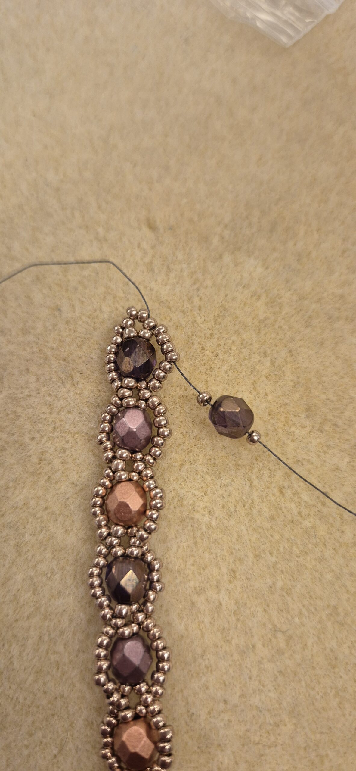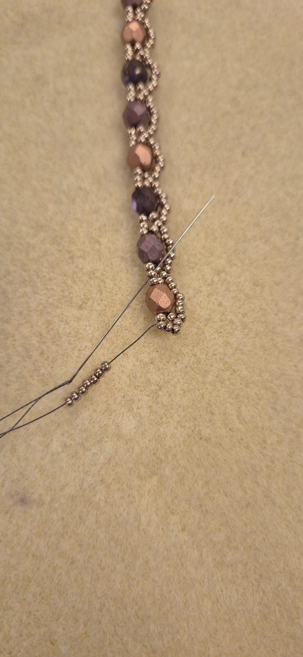 Neem nu de andere draad, want we gaan eerst verder met de andere zijde. Rijg 6 rocailles en plaats ze tussen de eerste en tweede facet door de middelste rocaille, net zoals je aan de andere kant hebt gedaan. Ga door met dit patroon totdat je niet verder kunt.