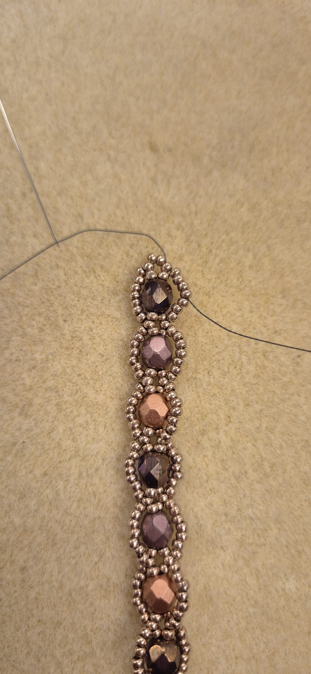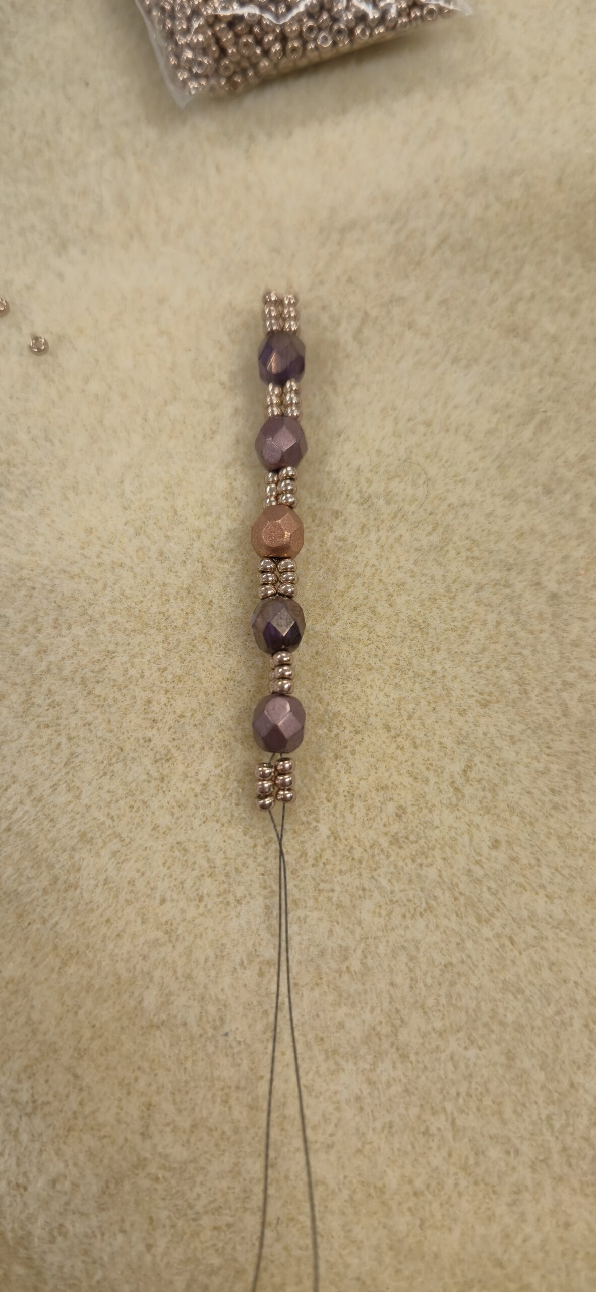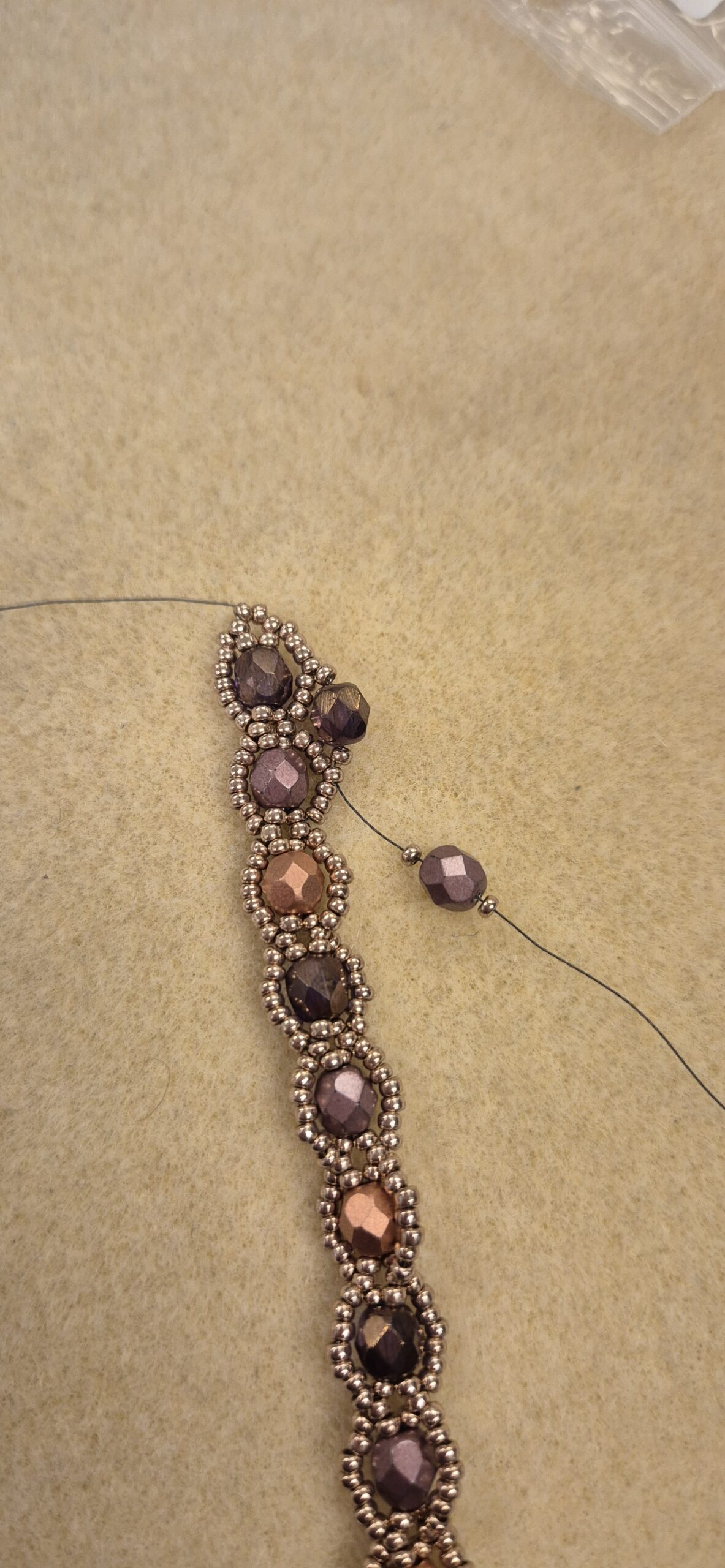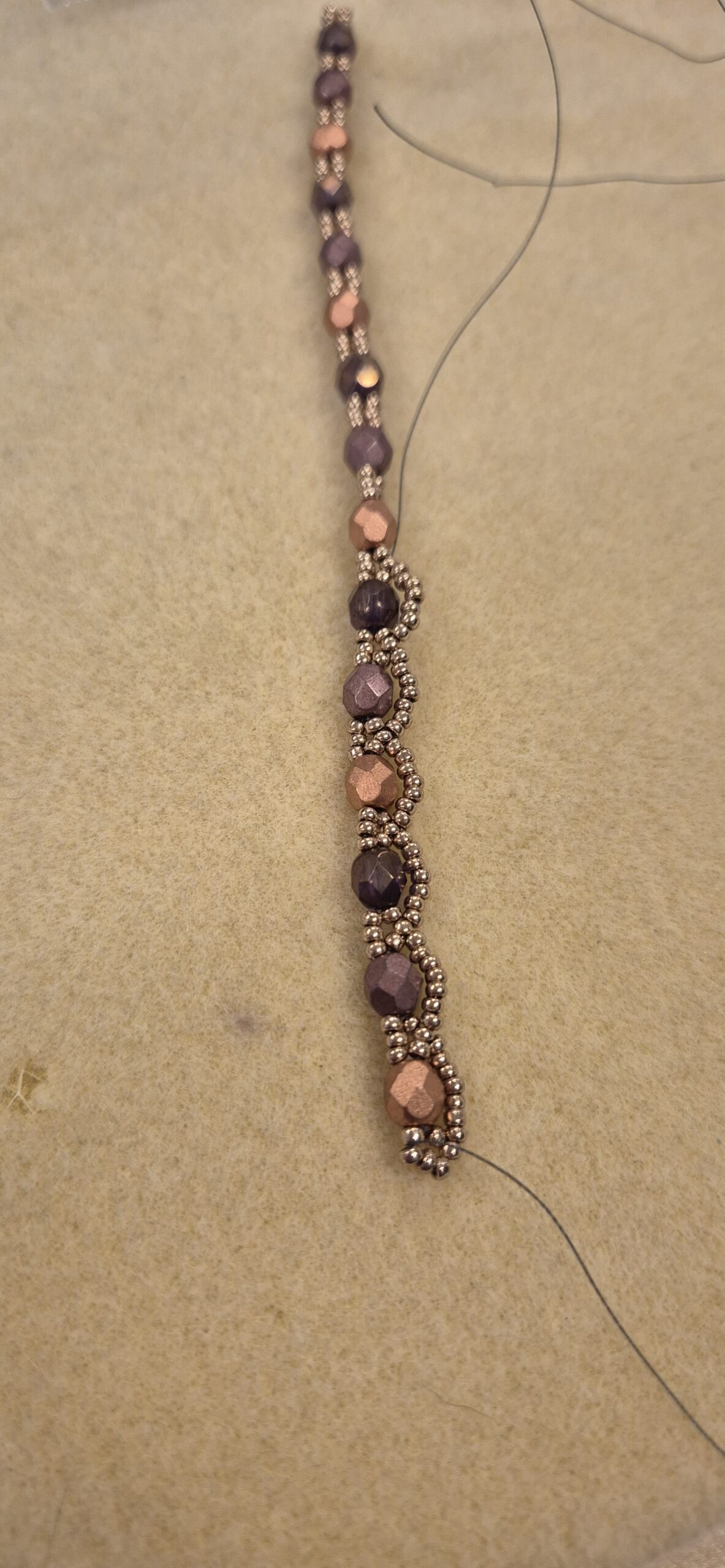 Neem nu de andere draad, want we gaan eerst verder met de andere zijde. Rijg 6 rocailles en plaats ze tussen de eerste en tweede facet door de middelste rocaille, net zoals je aan de andere kant hebt gedaan. Ga door met dit patroon totdat je niet verder kunt.