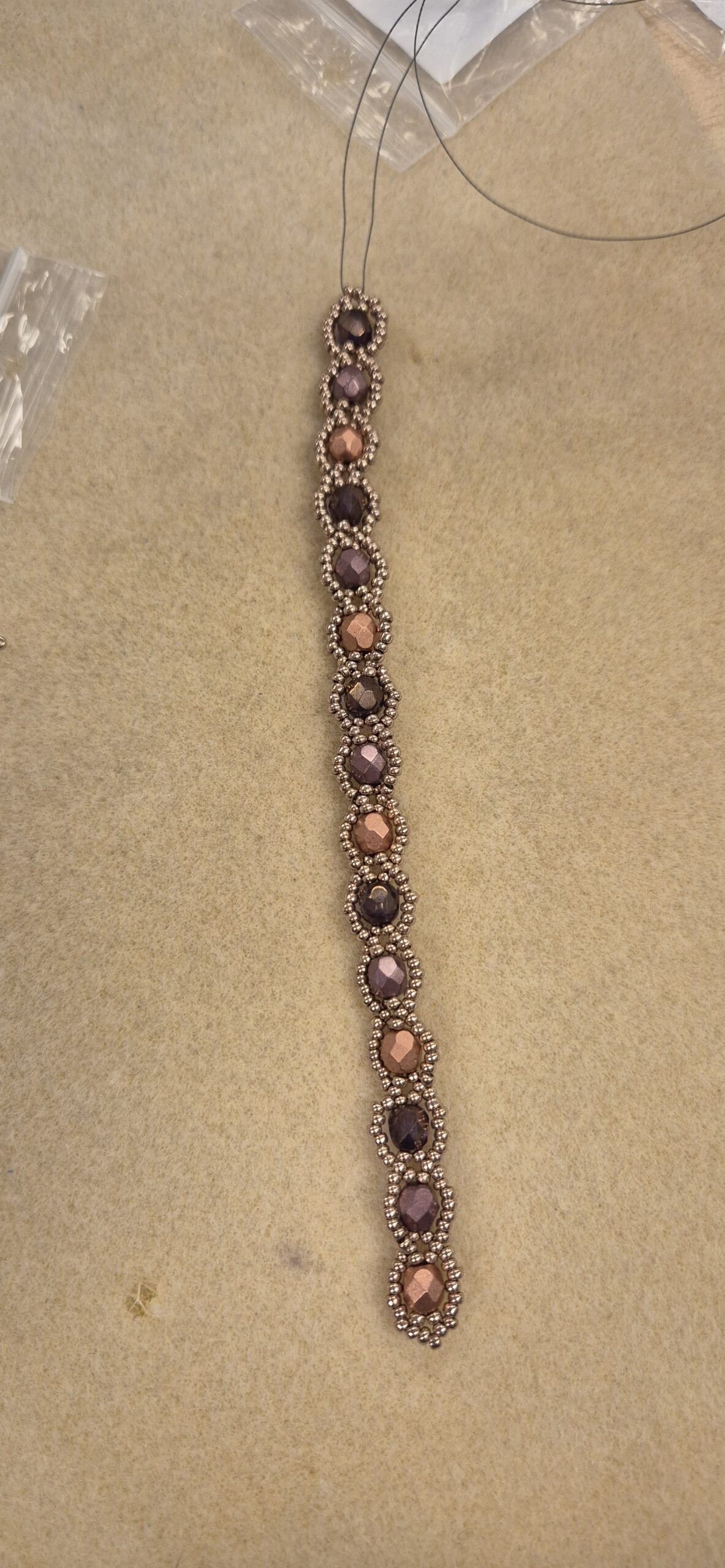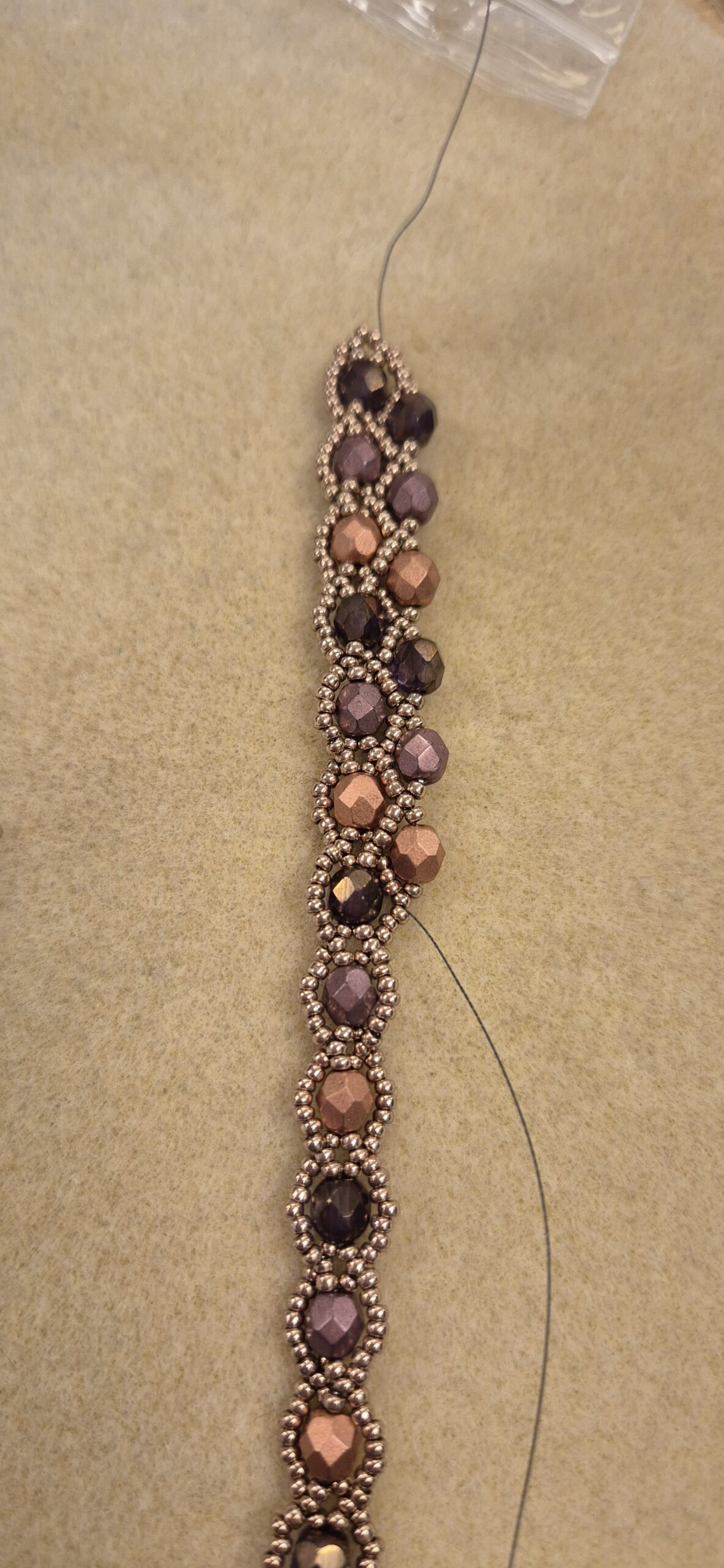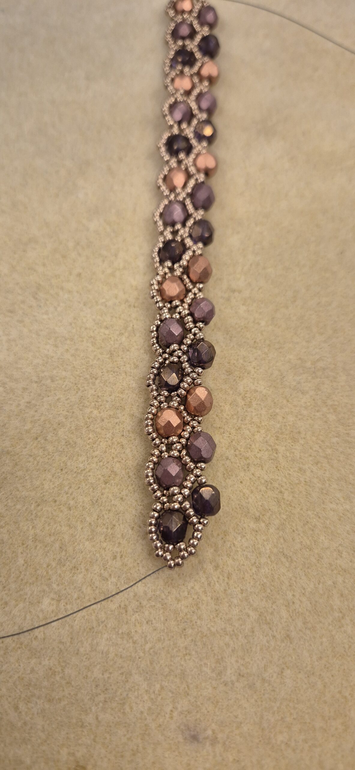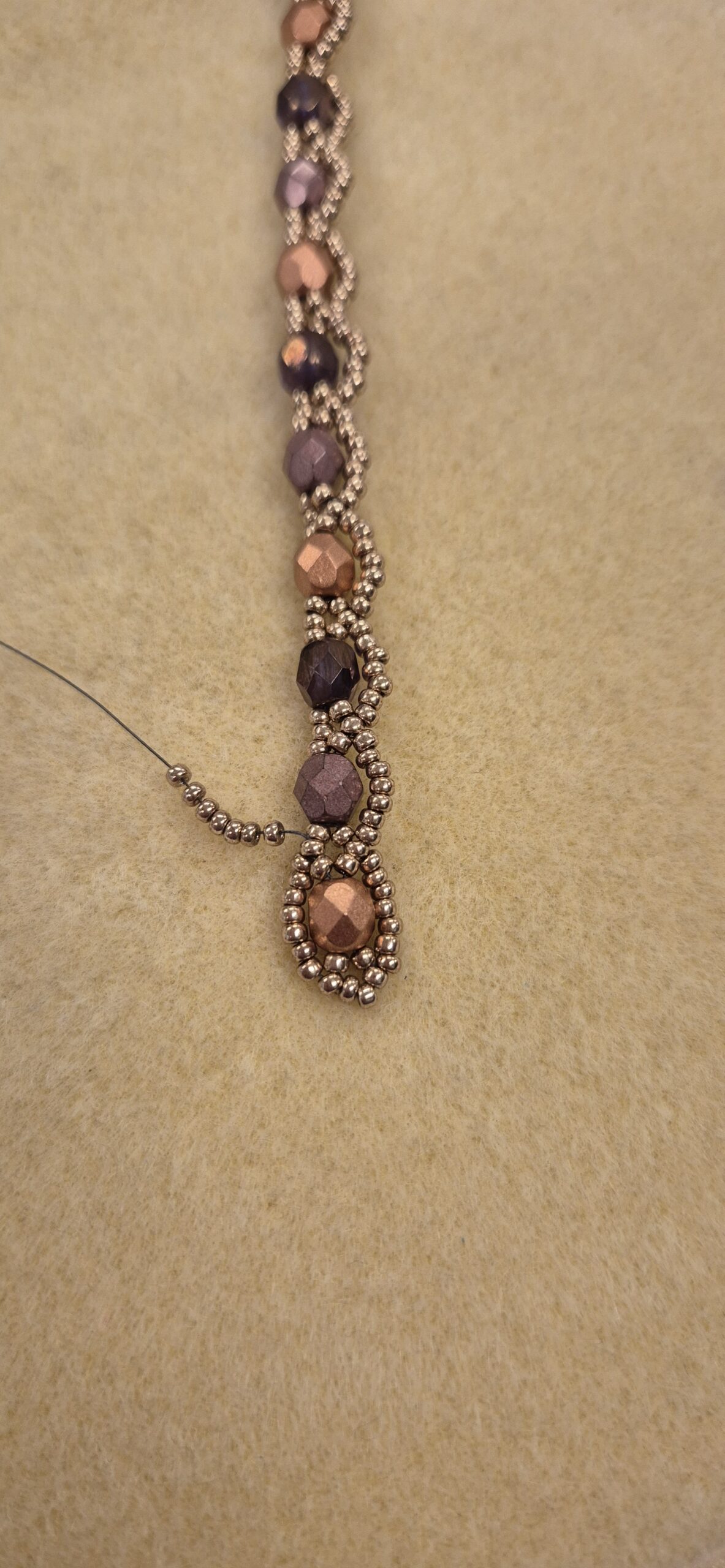 Neem nu de andere draad, want we gaan eerst verder met de andere zijde. Rijg 6 rocailles en plaats ze tussen de eerste en tweede facet door de middelste rocaille, net zoals je aan de andere kant hebt gedaan. Ga door met dit patroon totdat je niet verder kunt.