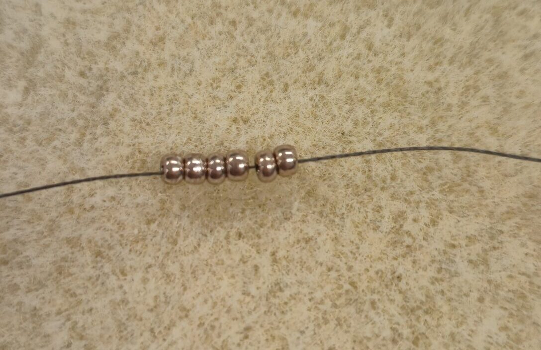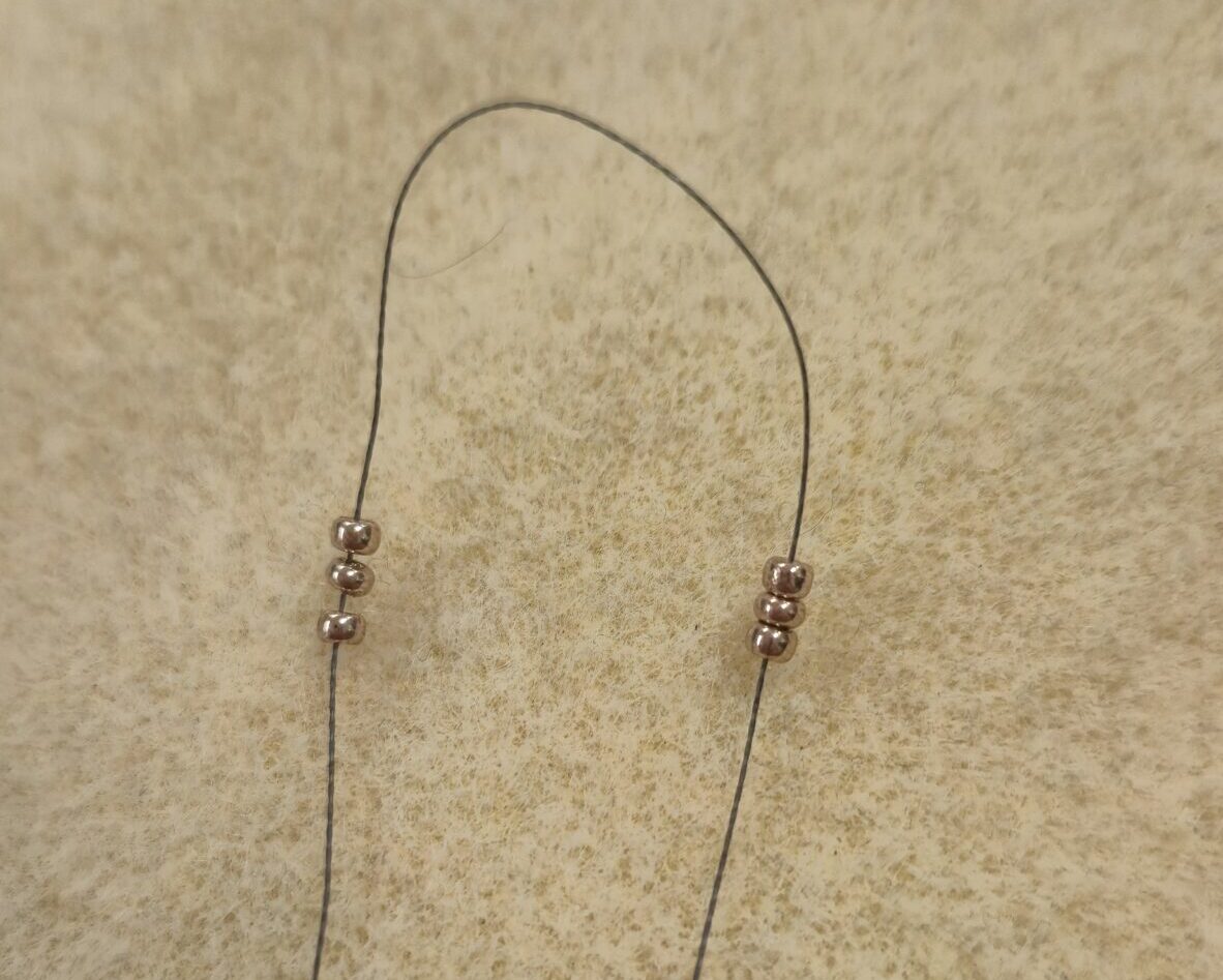 Knip een draad van ongeveer 120 cm lang af. Rijg vervolgens 6 kralen aan de draad en schuif ze door naar het midden van de draad. We beginnen in het midden van de armband en gaan vervolgens met de linker draad rechts verder en met de rechter draad links verder rijgen . Zorg ervoor dat er aan elke kant 3 kralen zitten, 3 kralen links en 3 kralen rechts.