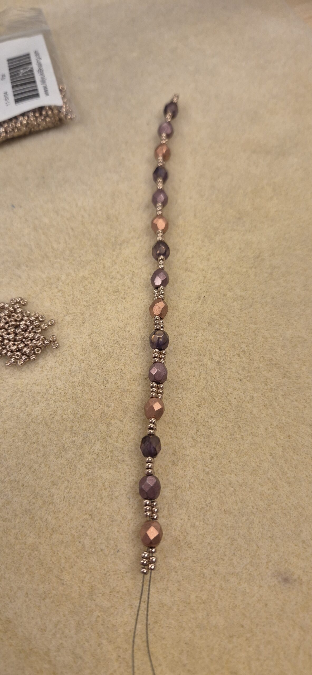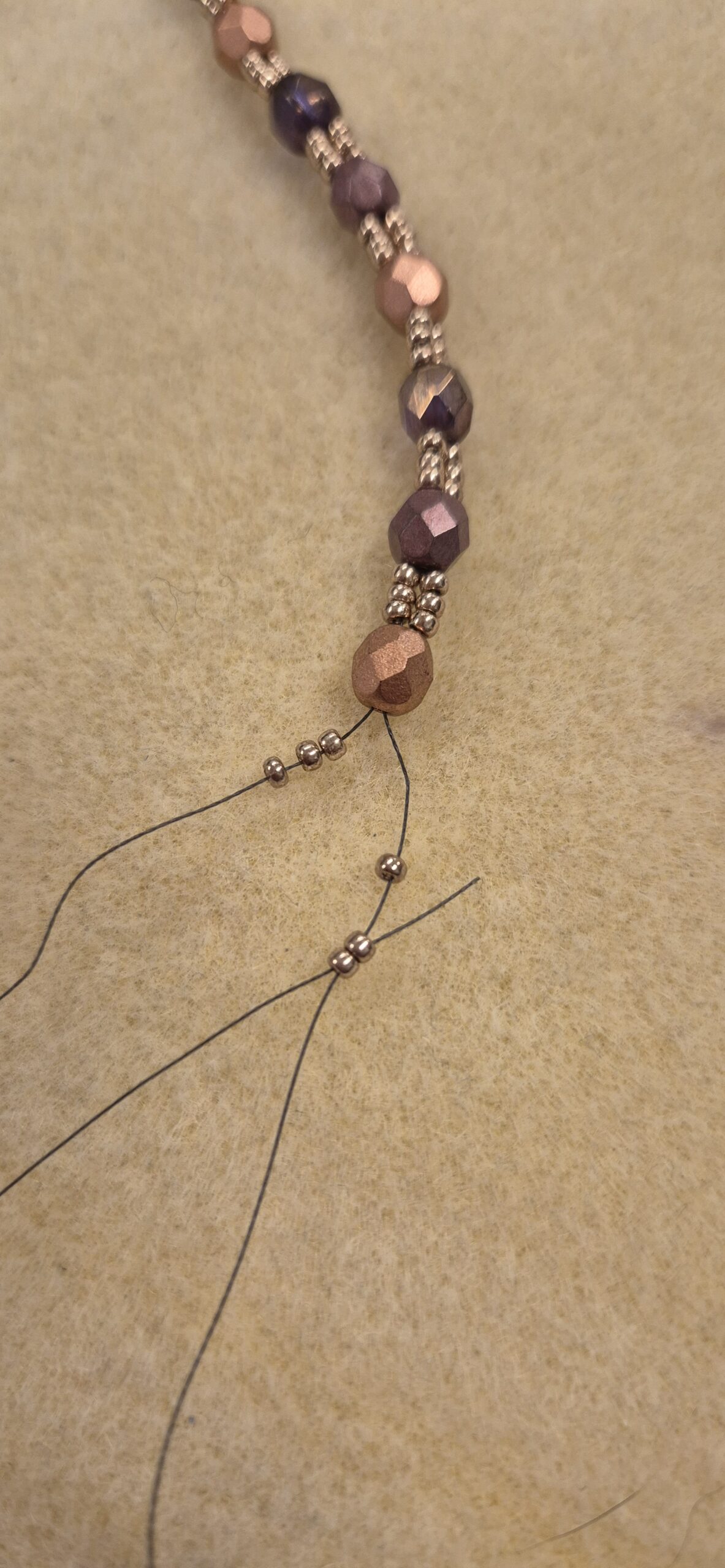 Rijg eerst één facetkraal op beide draden tegelijk. Vervolgens rijg je drie rocaille kralen op beide draden tegelijk. Herhaal dit patroon totdat je in totaal vijftien facetkralen hebt geregen en eindig met drie rocaille kralen op beide draden.