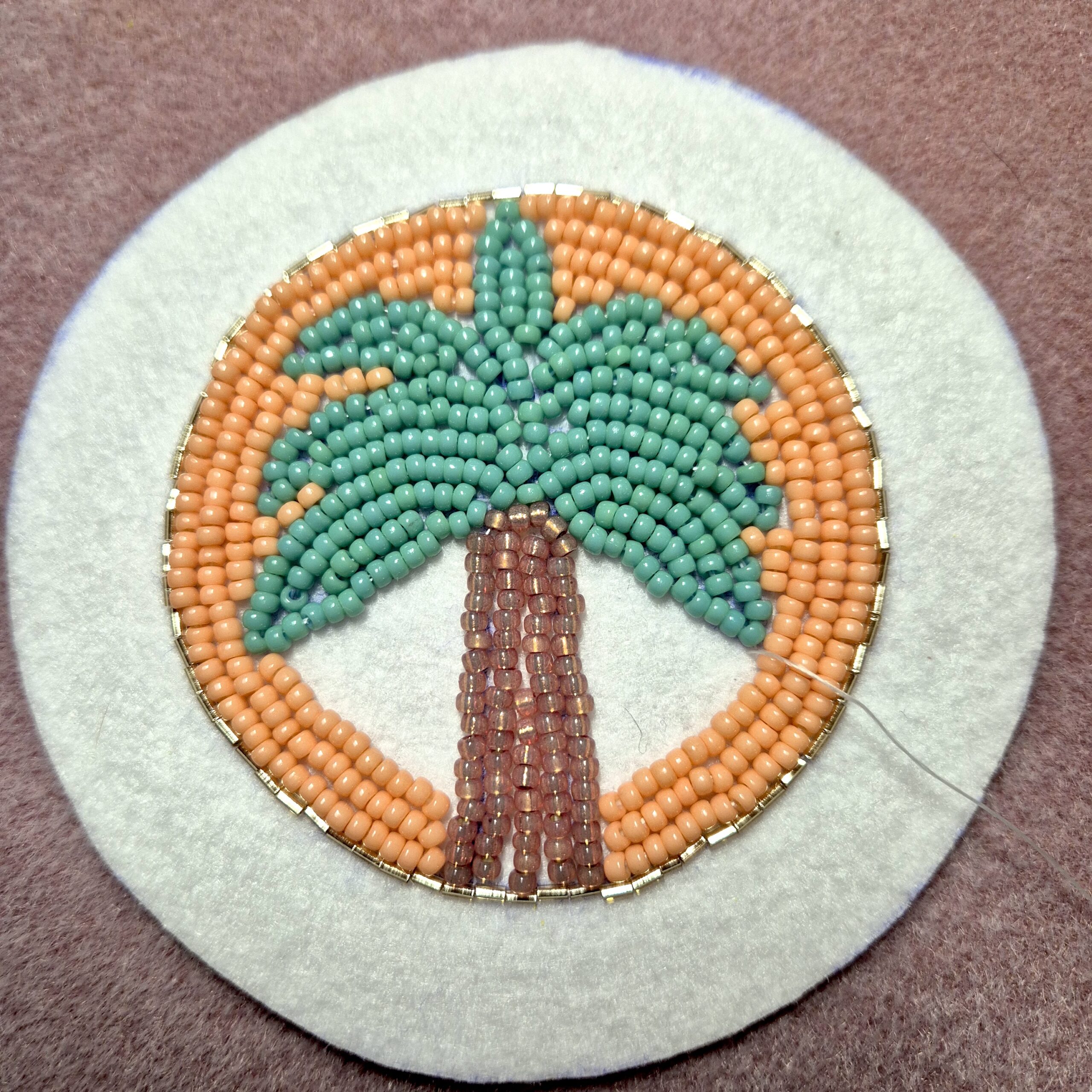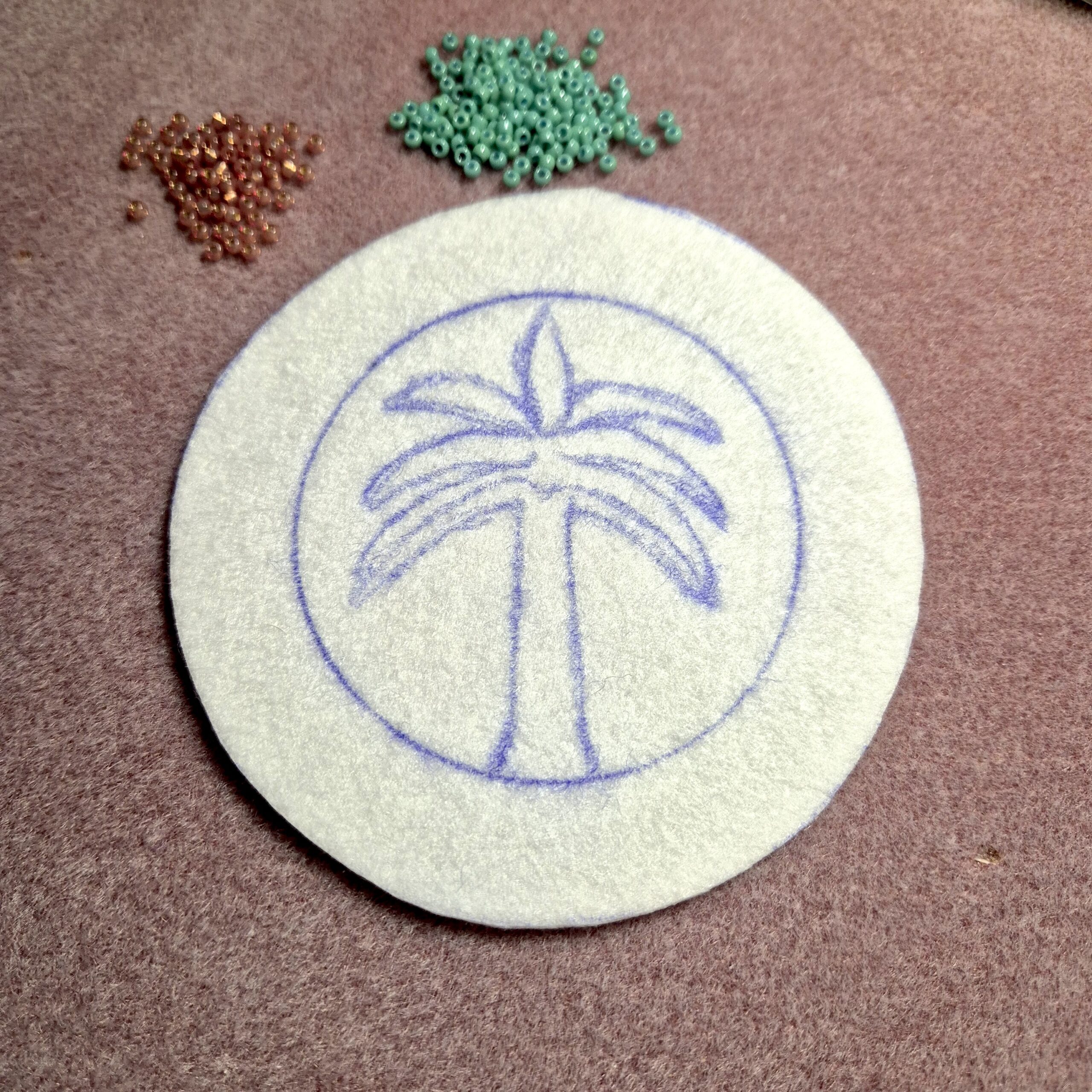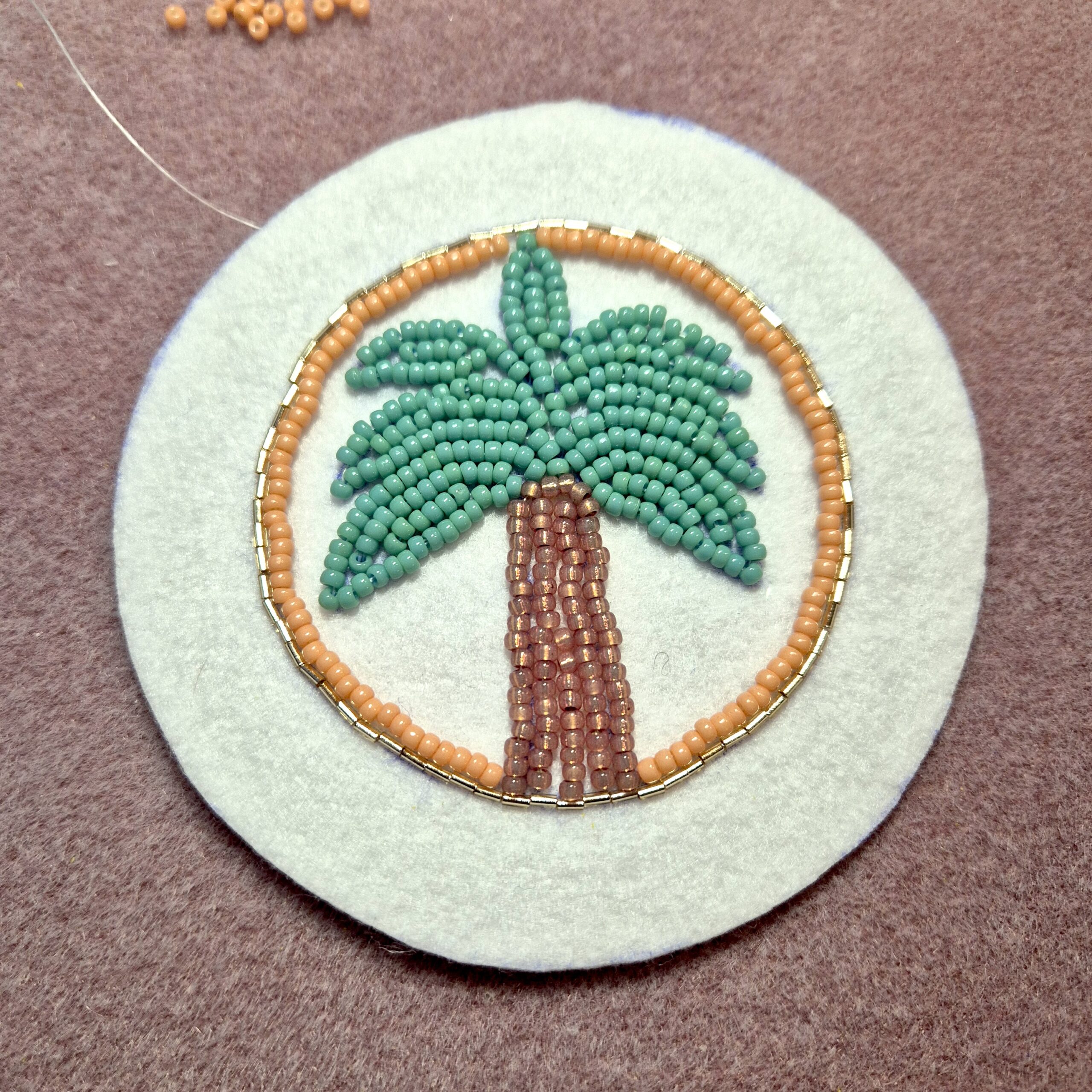 Leg je onderzetter op een stukje vilt (deze is van de Hema) en knip het vilt precies langs de rand van je onderzetter af. Plaats het vilt onder je onderzetter, want we gaan het tegelijk met de Miyuki bugles kralen vastnaaien. Rijg een bugle op je draad en steek de naald zo dicht mogelijk tegen de kralen van de buitenste rand door de foundation en het vilt. Rijg vervolgens de volgende bugle op de draad en steek de naald weer zo dicht mogelijk tegen je rijgwerk, net iets naast de eerste bugle. Trek de draad aan en leg, indien nodig, de bugles op de juiste plek voordat je met de volgende kraal begint. Je maakt dus een soort van rondjes om het vilt en de foundation heen. Op deze manier krijg je een mooi randje en bevestig je tegelijkertijd het vilt aan je onderzetter.