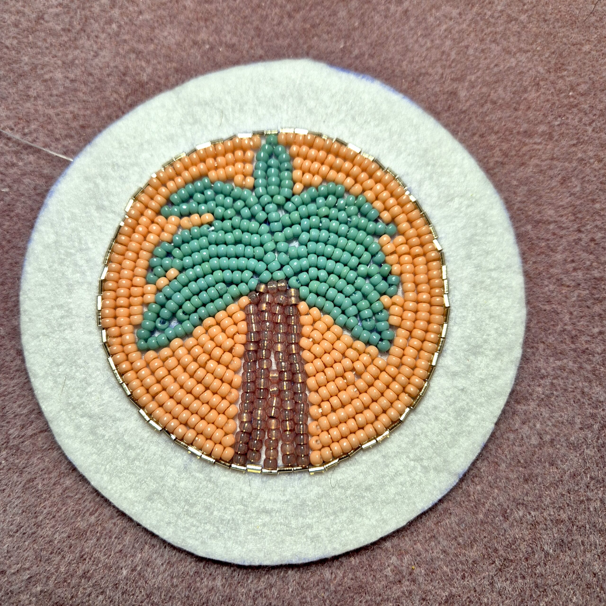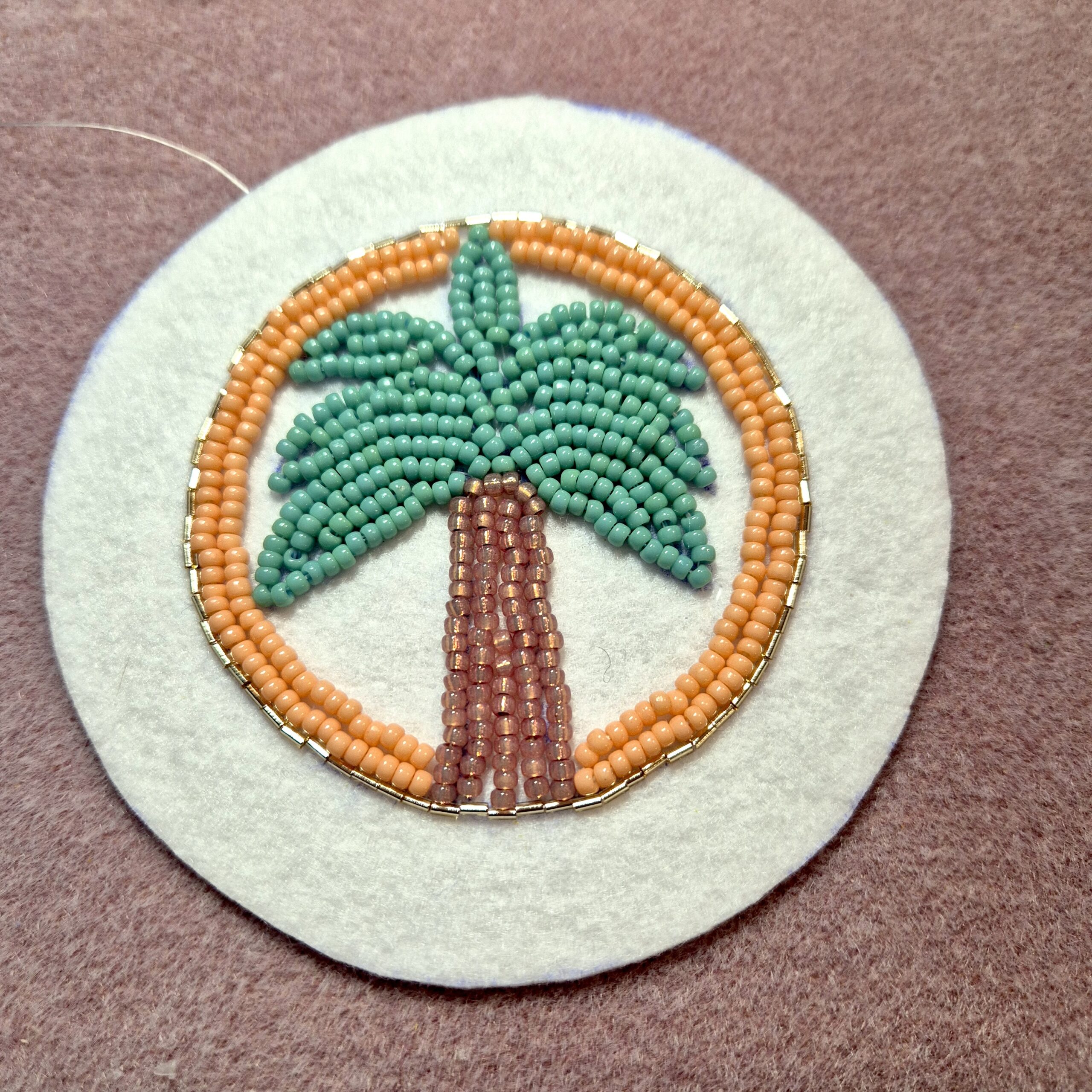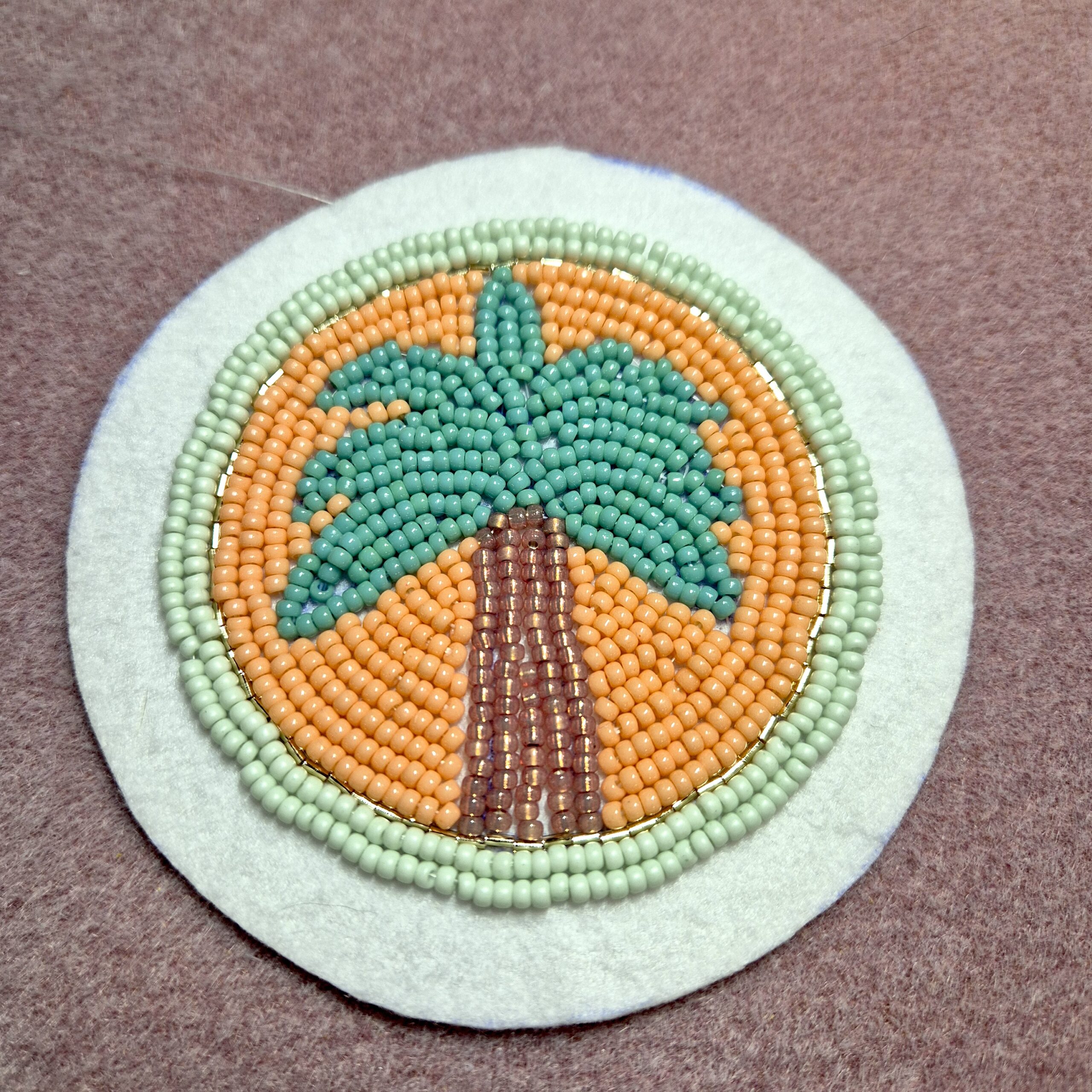 Leg je onderzetter op een stukje vilt (deze is van de Hema) en knip het vilt precies langs de rand van je onderzetter af. Plaats het vilt onder je onderzetter, want we gaan het tegelijk met de Miyuki bugles kralen vastnaaien. Rijg een bugle op je draad en steek de naald zo dicht mogelijk tegen de kralen van de buitenste rand door de foundation en het vilt. Rijg vervolgens de volgende bugle op de draad en steek de naald weer zo dicht mogelijk tegen je rijgwerk, net iets naast de eerste bugle. Trek de draad aan en leg, indien nodig, de bugles op de juiste plek voordat je met de volgende kraal begint. Je maakt dus een soort van rondjes om het vilt en de foundation heen. Op deze manier krijg je een mooi randje en bevestig je tegelijkertijd het vilt aan je onderzetter.