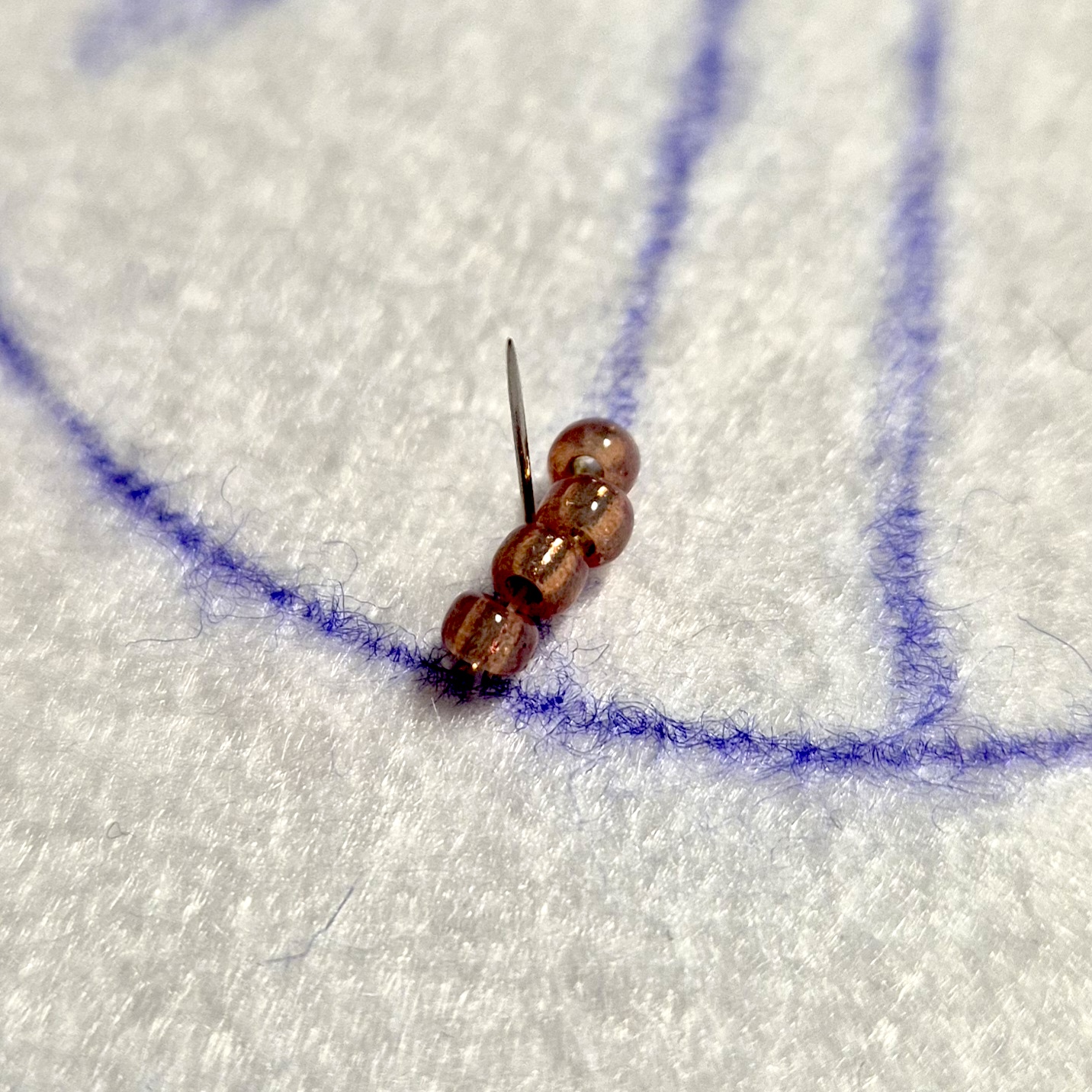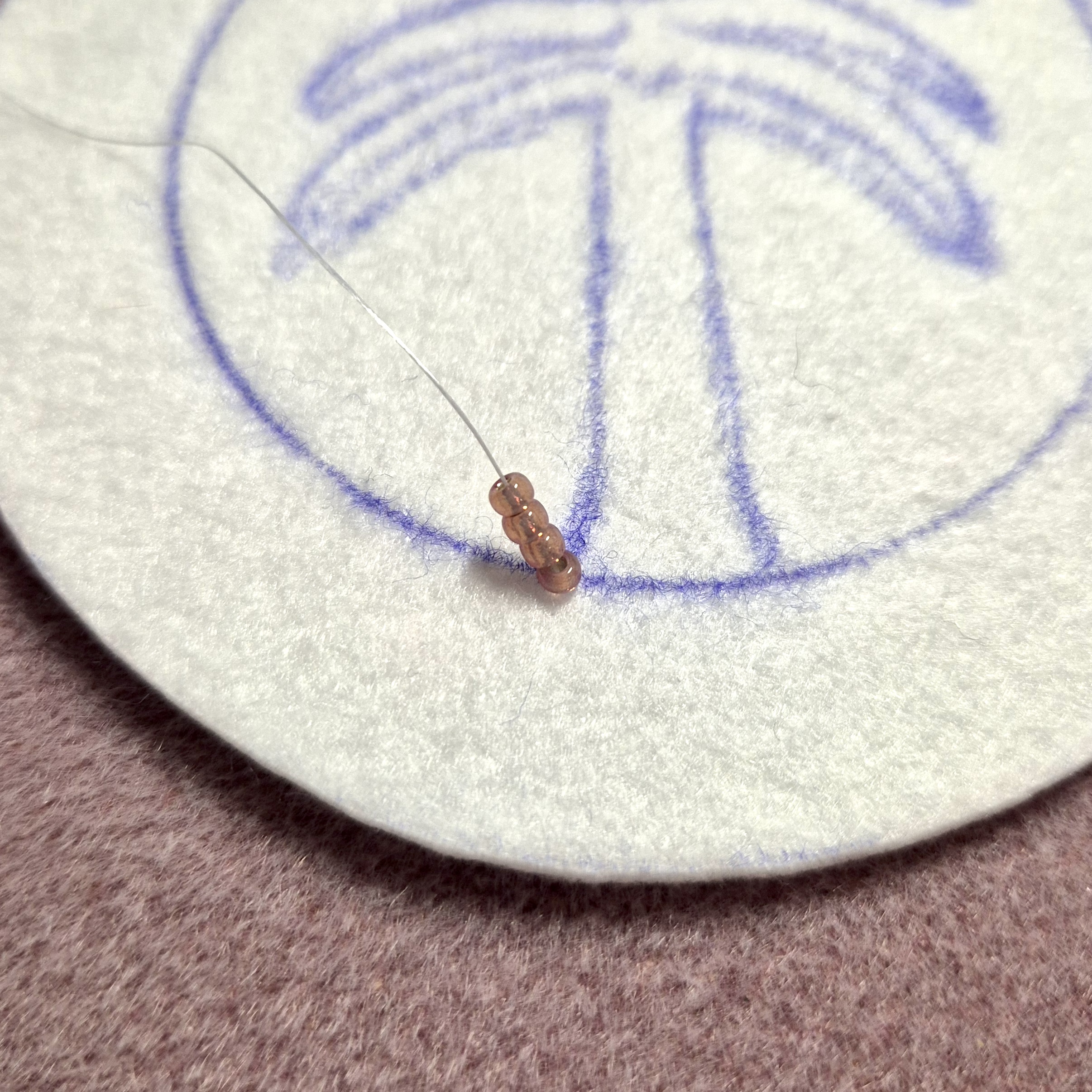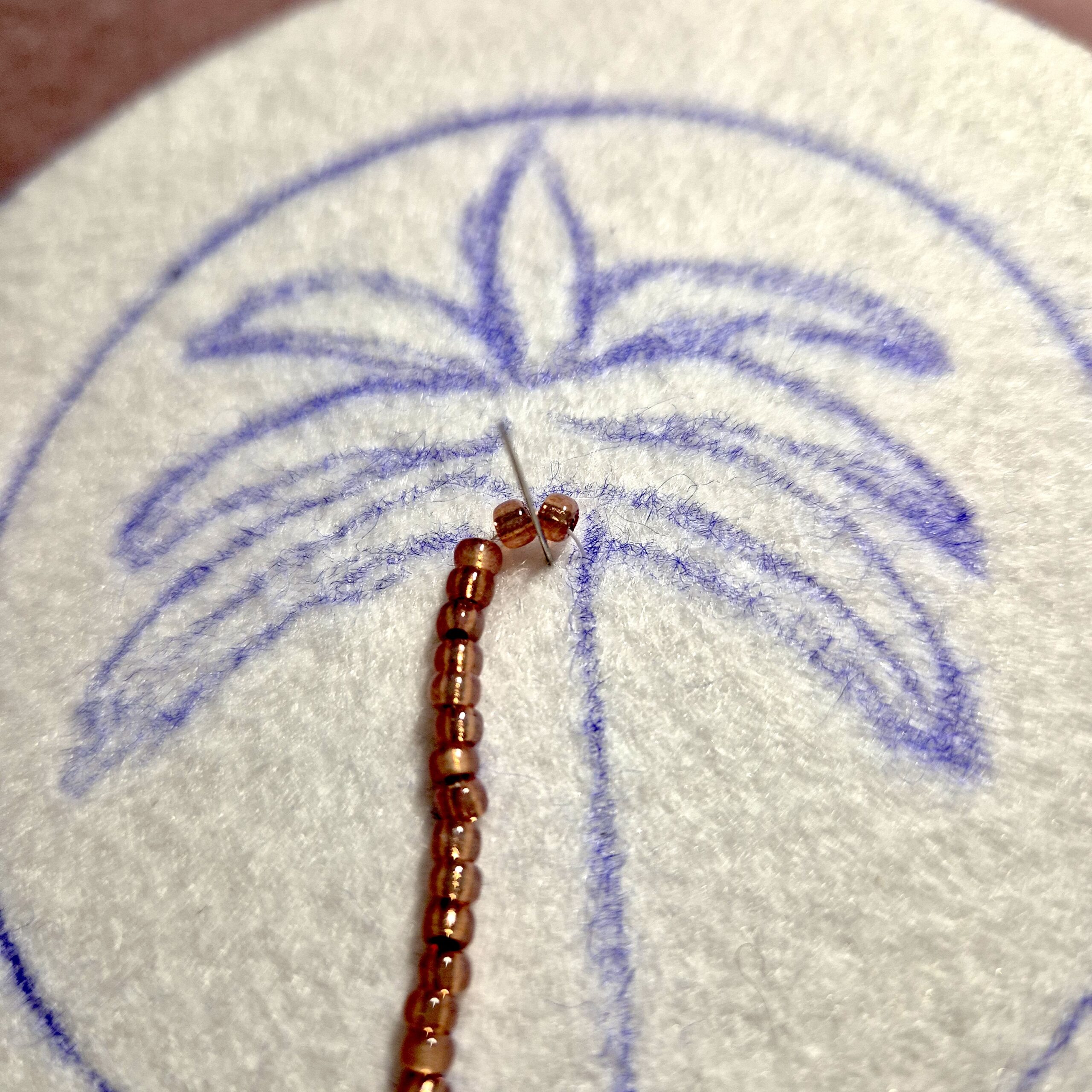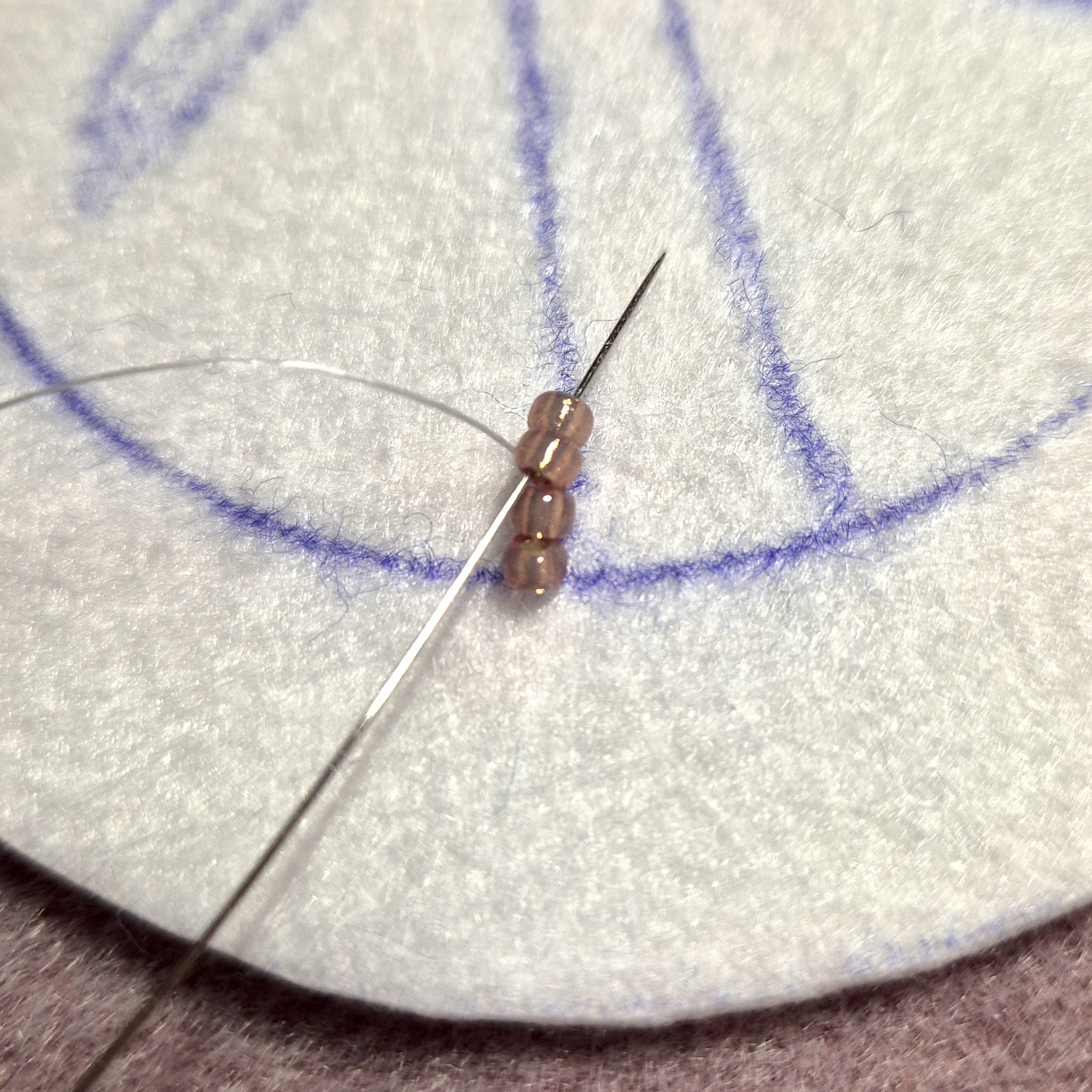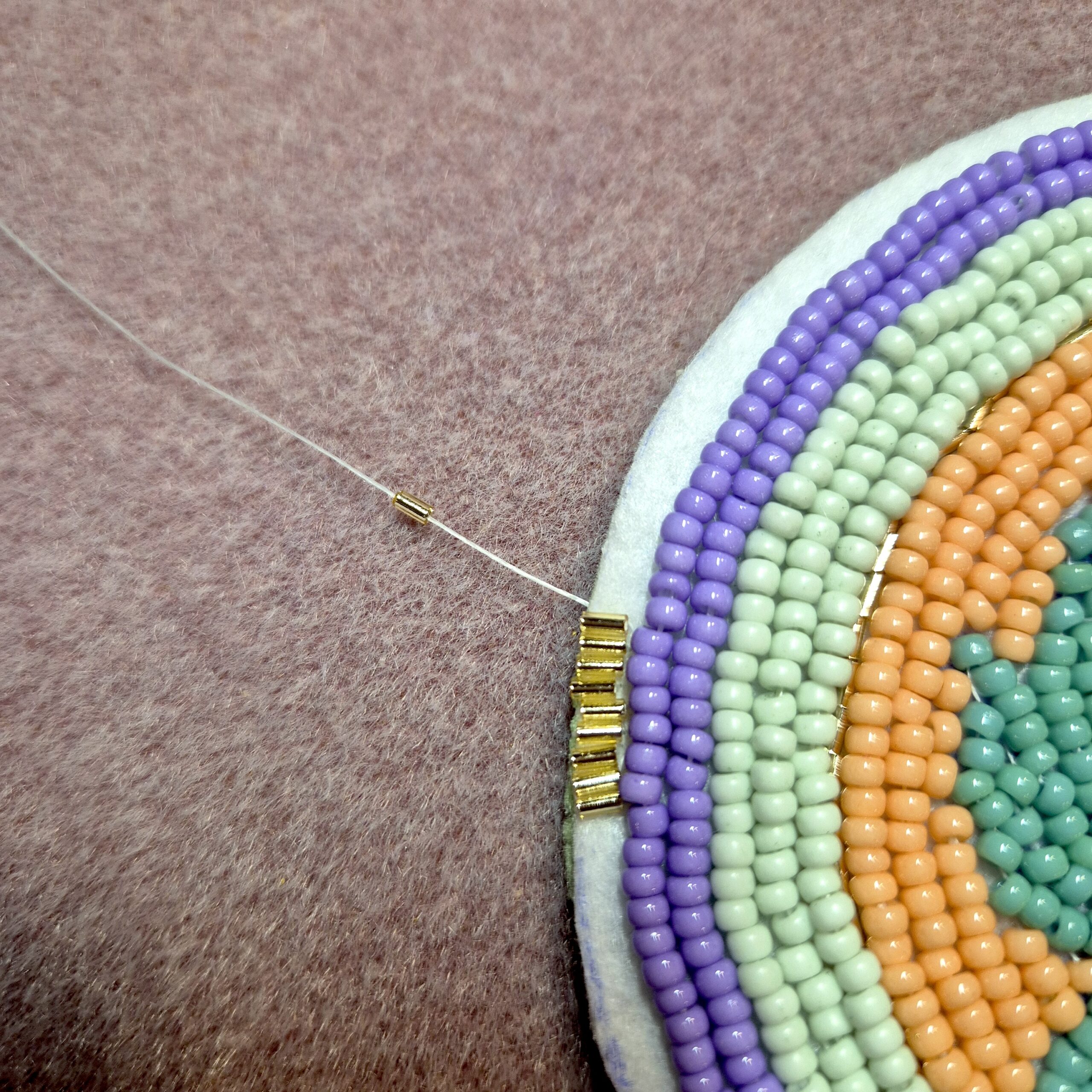 Als je op een nieuwe plek wilt verdergaan met borduren, steek dan eerst je naald door de foundation naar beneden na het rijgen van je laatste kraal. Vervolgens steek je de naald op de nieuwe plaats weer omhoog. Maak je geen zorgen over alle draden aan de onderkant, want daar komt uiteindelijk nog vilt overheen.