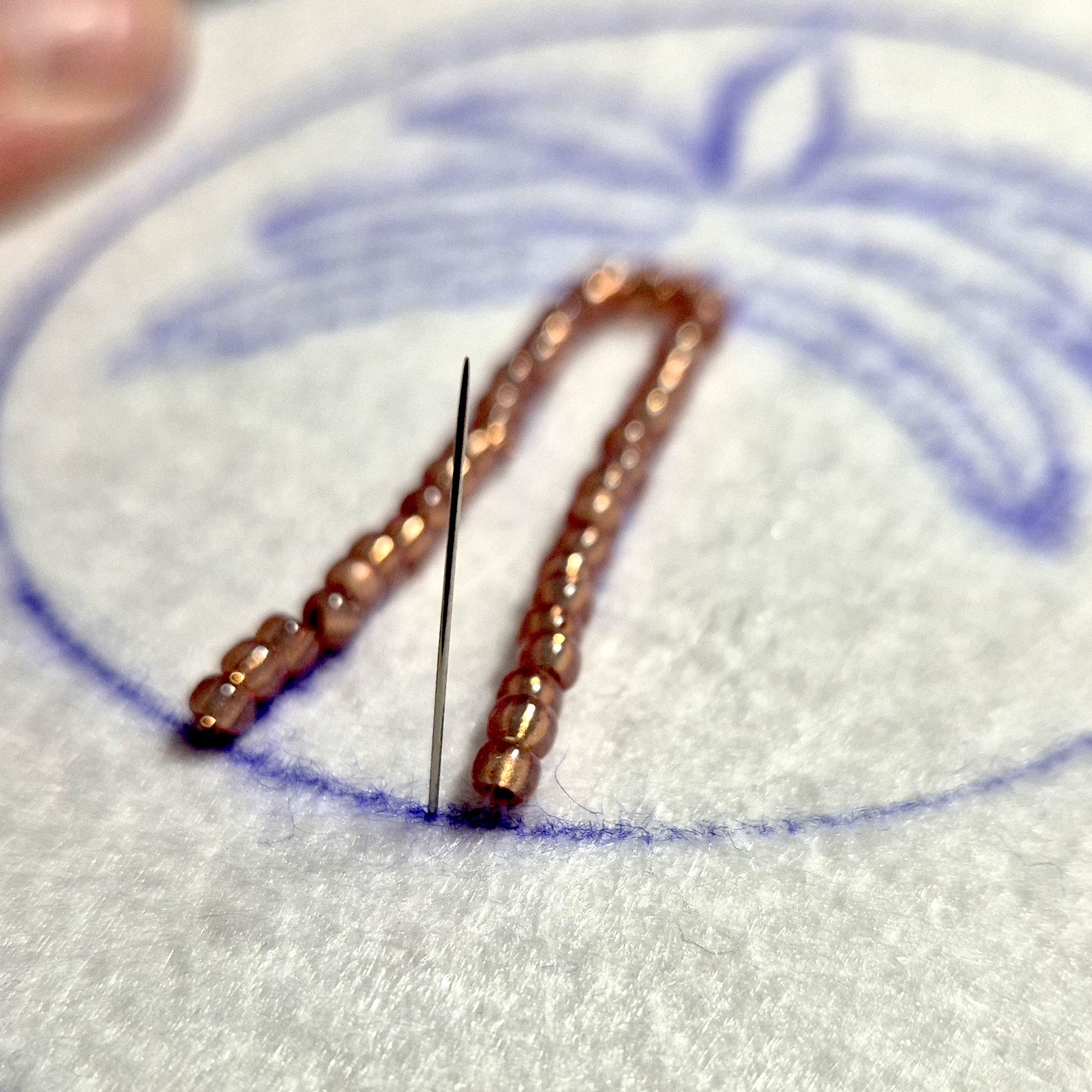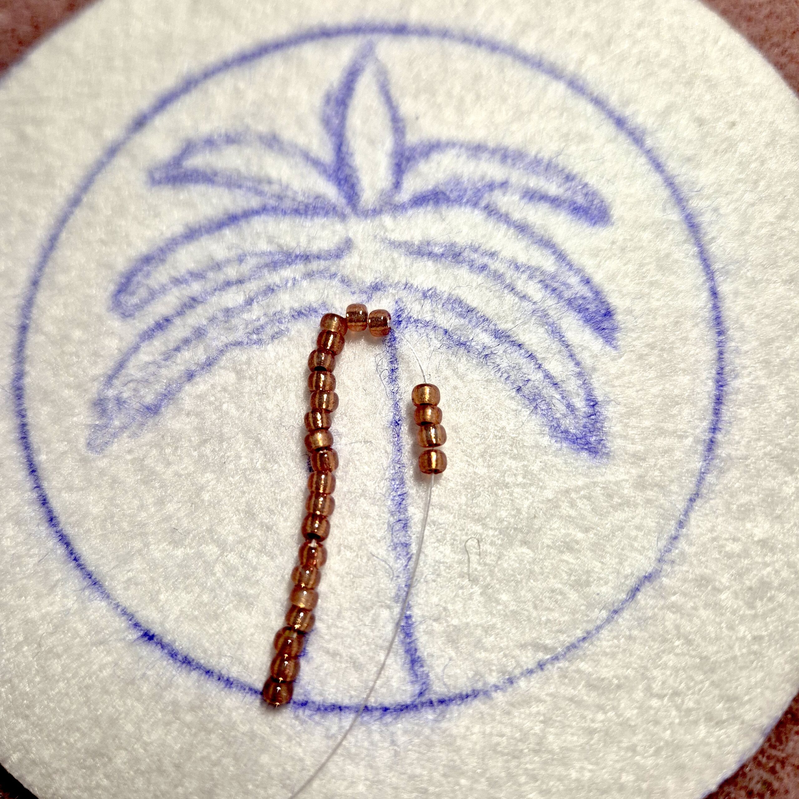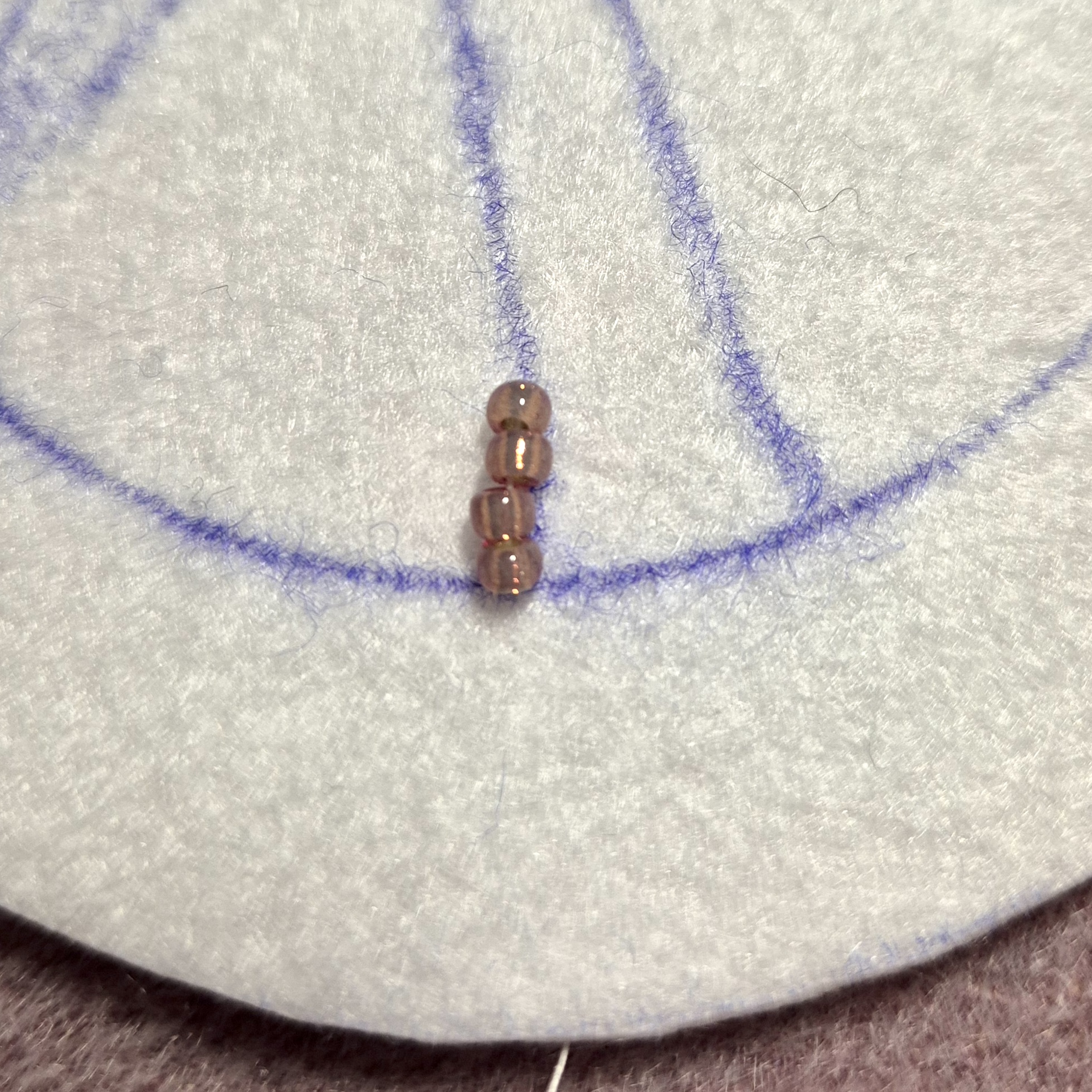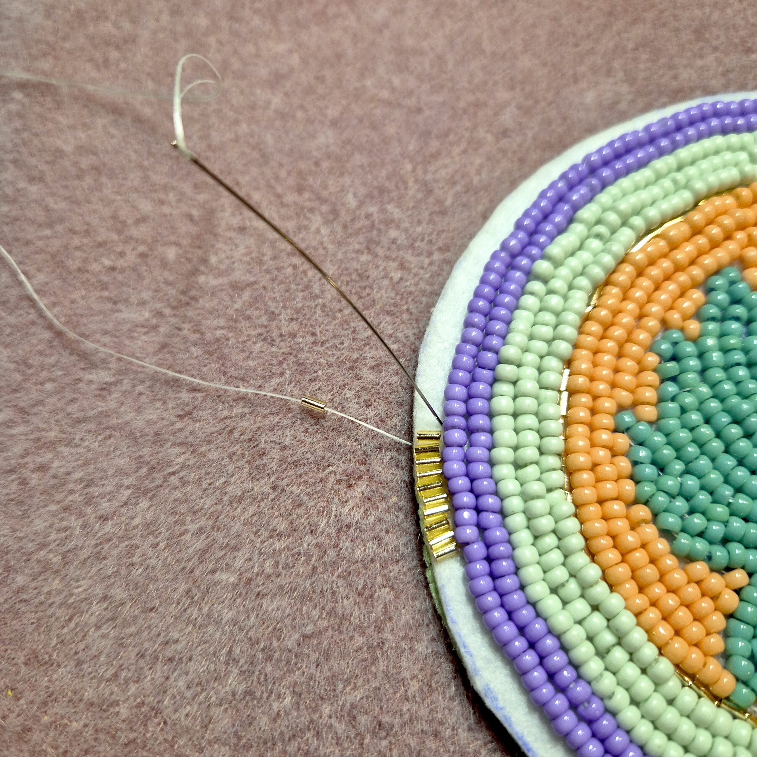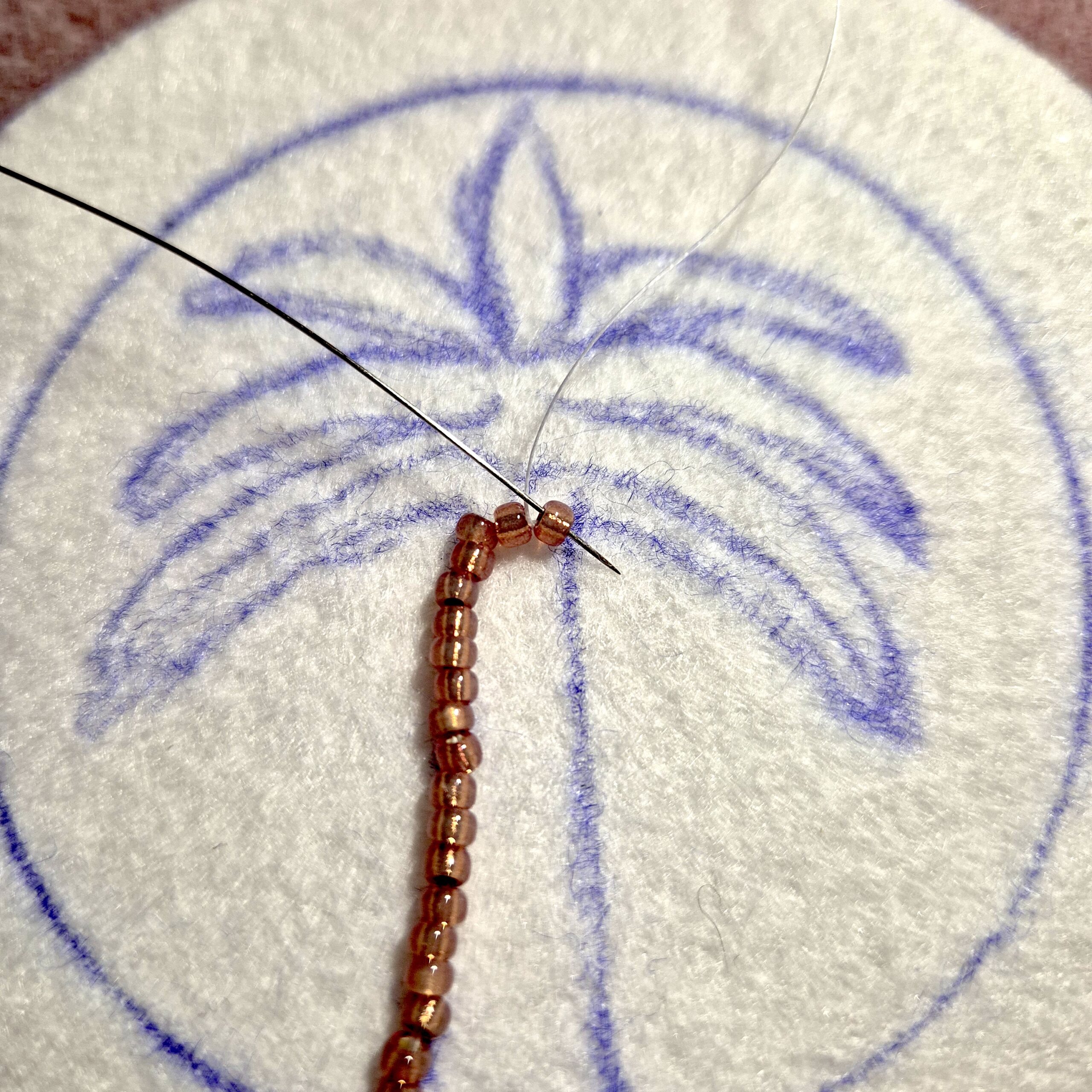 Als je op een nieuwe plek wilt verdergaan met borduren, steek dan eerst je naald door de foundation naar beneden na het rijgen van je laatste kraal. Vervolgens steek je de naald op de nieuwe plaats weer omhoog. Maak je geen zorgen over alle draden aan de onderkant, want daar komt uiteindelijk nog vilt overheen.