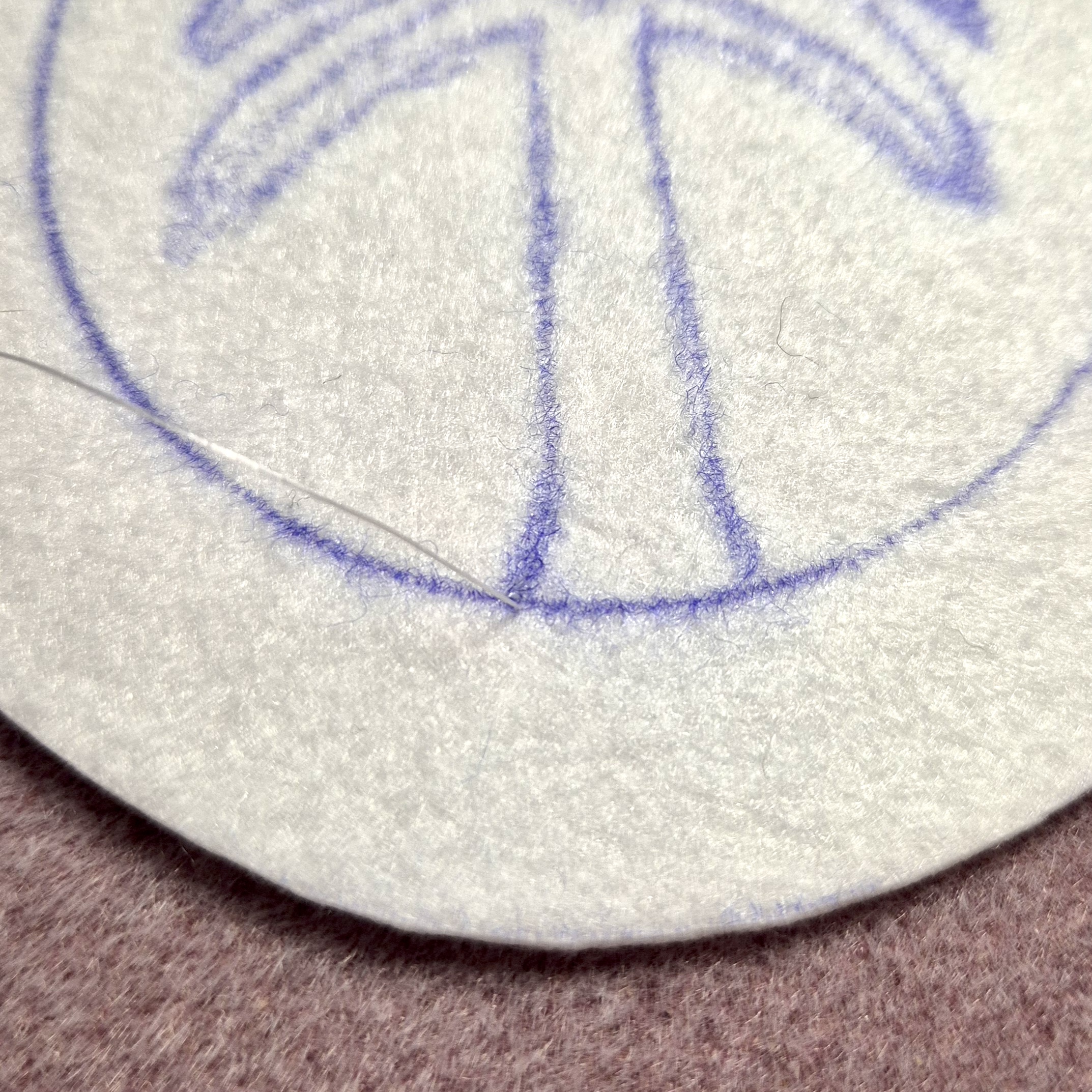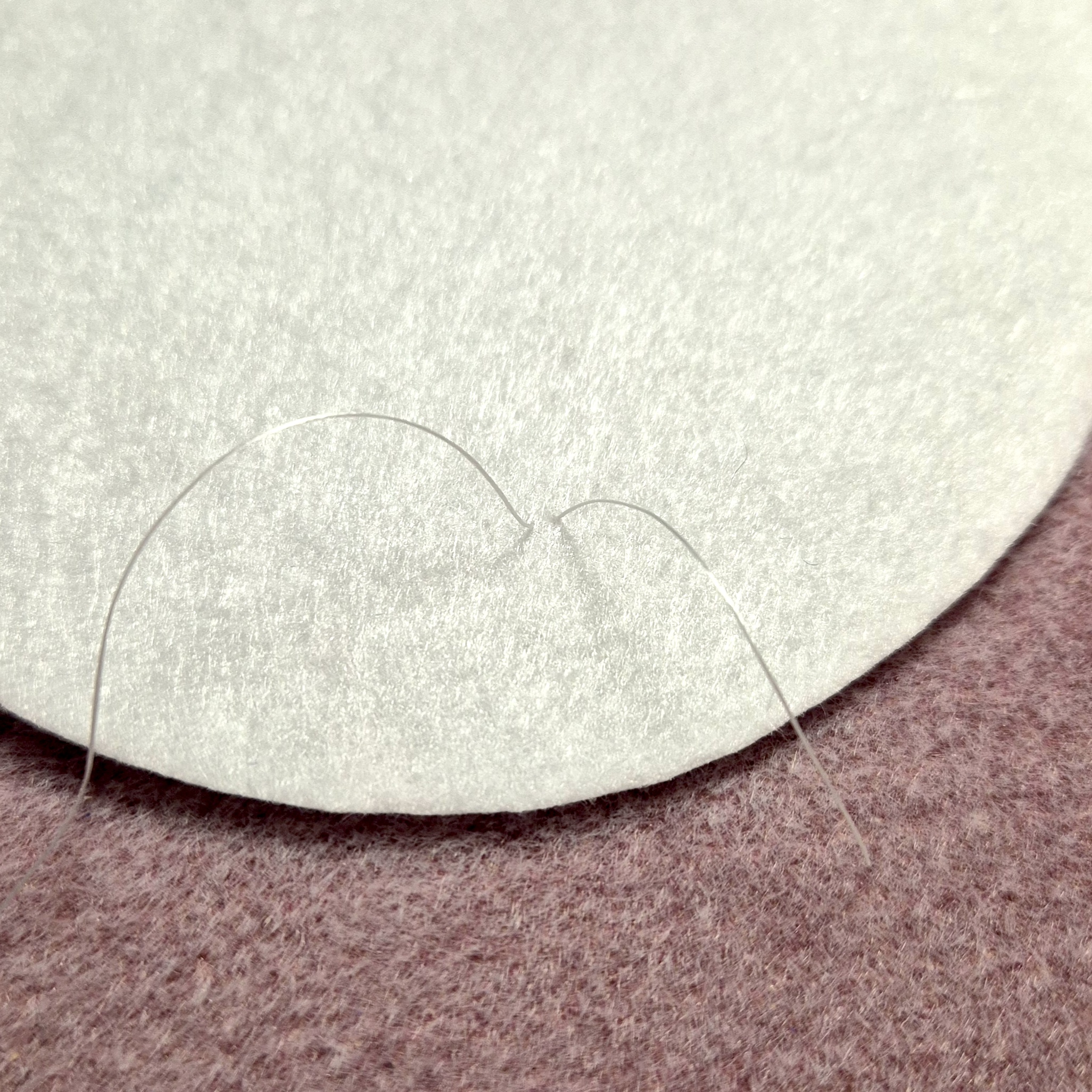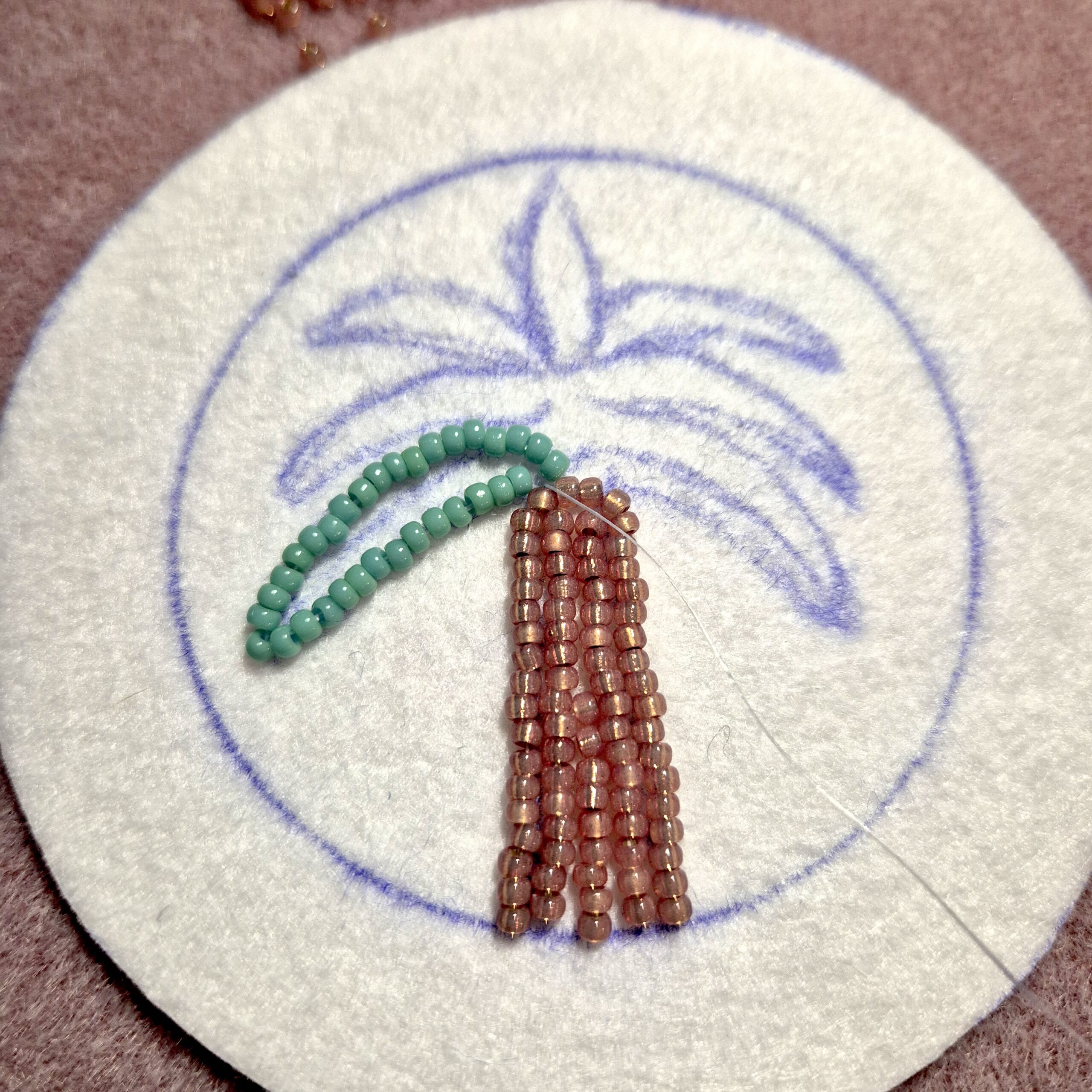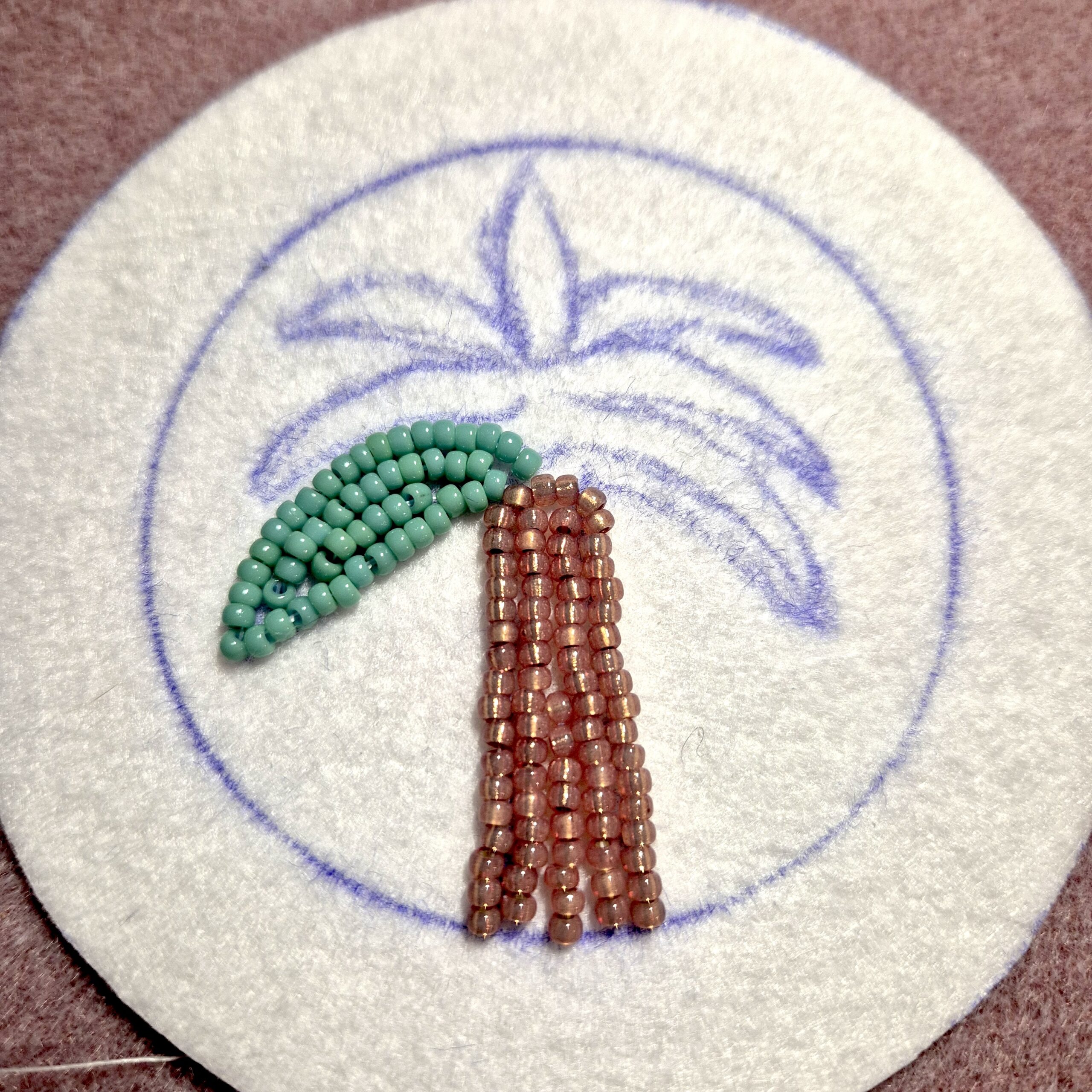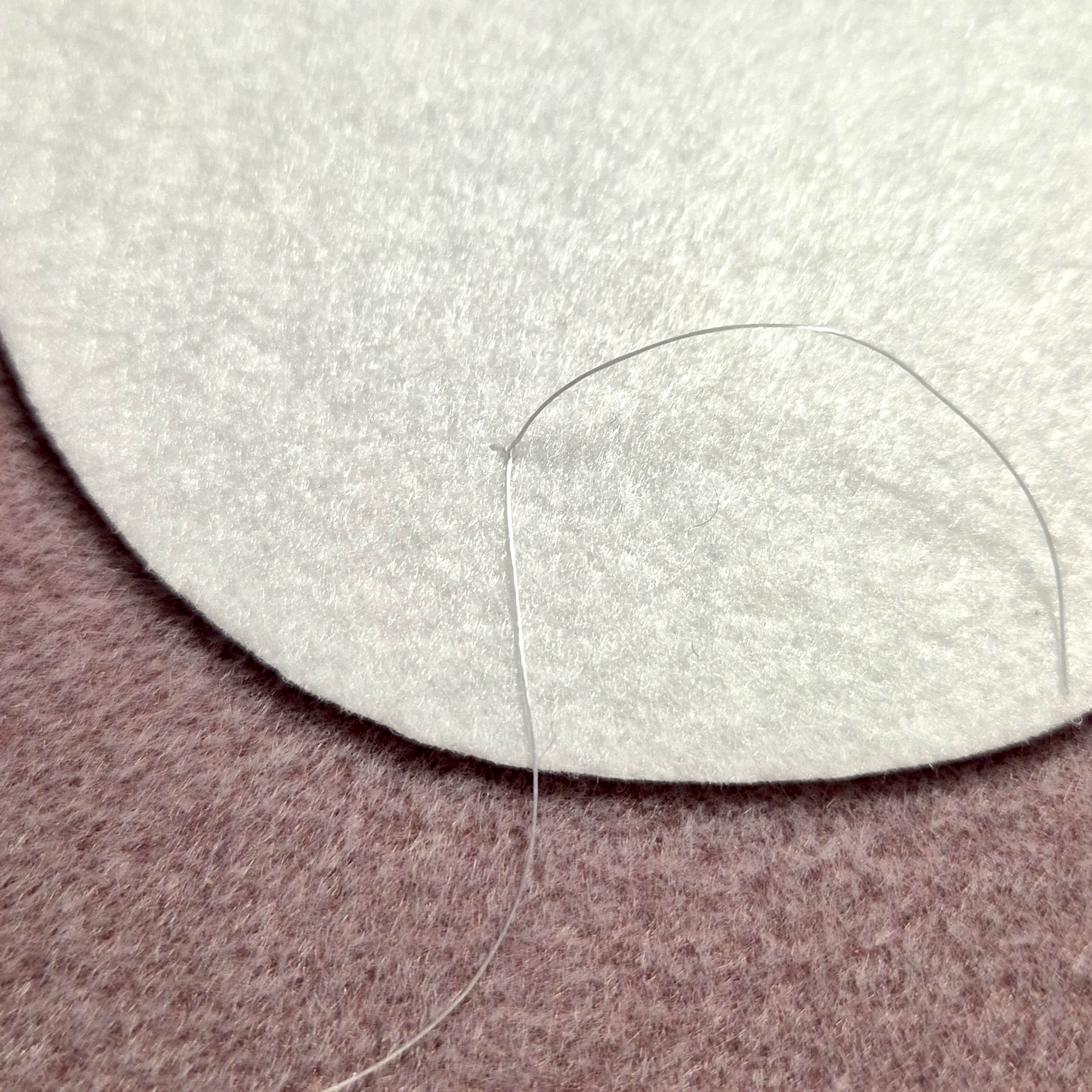 Als je op een nieuwe plek wilt verdergaan met borduren, steek dan eerst je naald door de foundation naar beneden na het rijgen van je laatste kraal. Vervolgens steek je de naald op de nieuwe plaats weer omhoog. Maak je geen zorgen over alle draden aan de onderkant, want daar komt uiteindelijk nog vilt overheen.