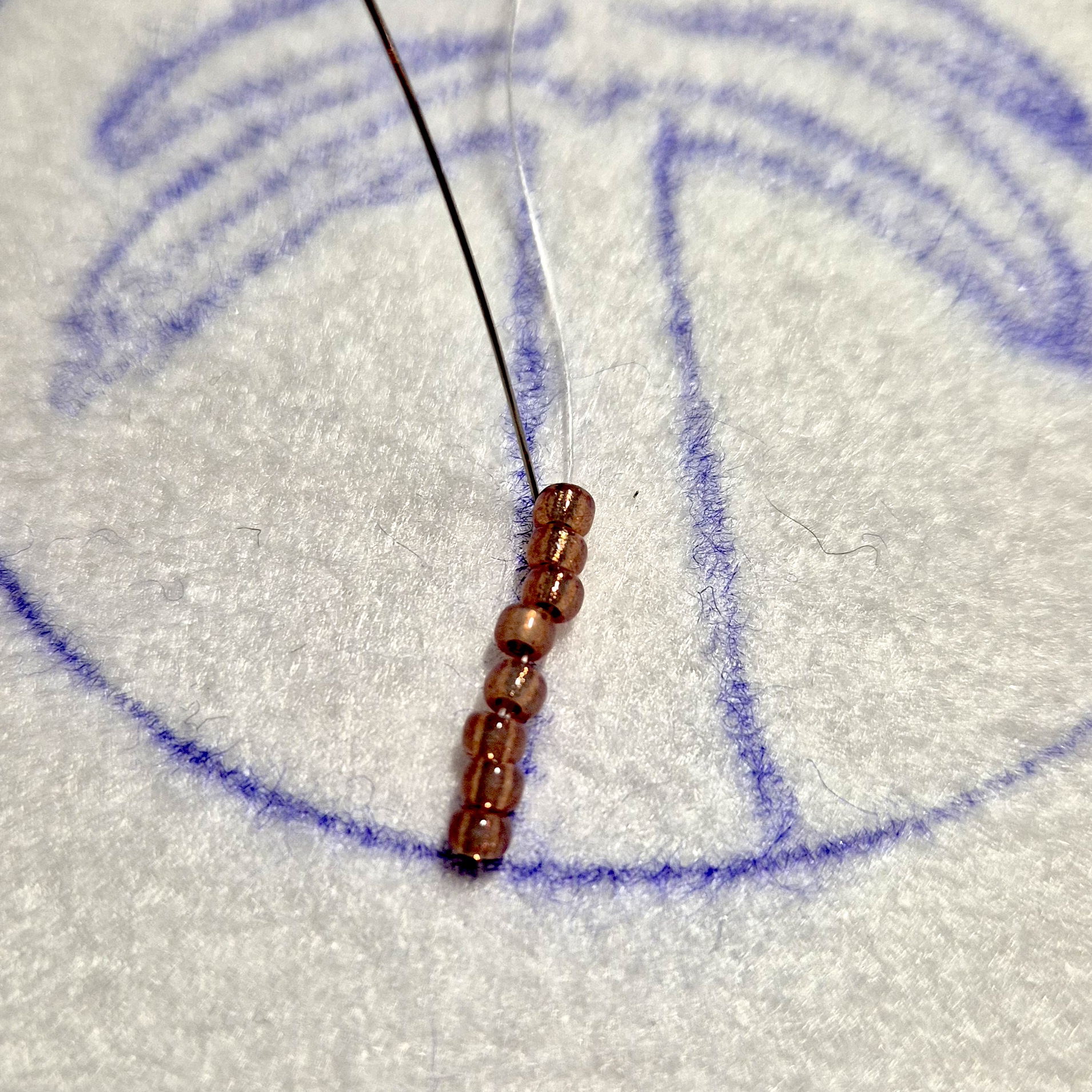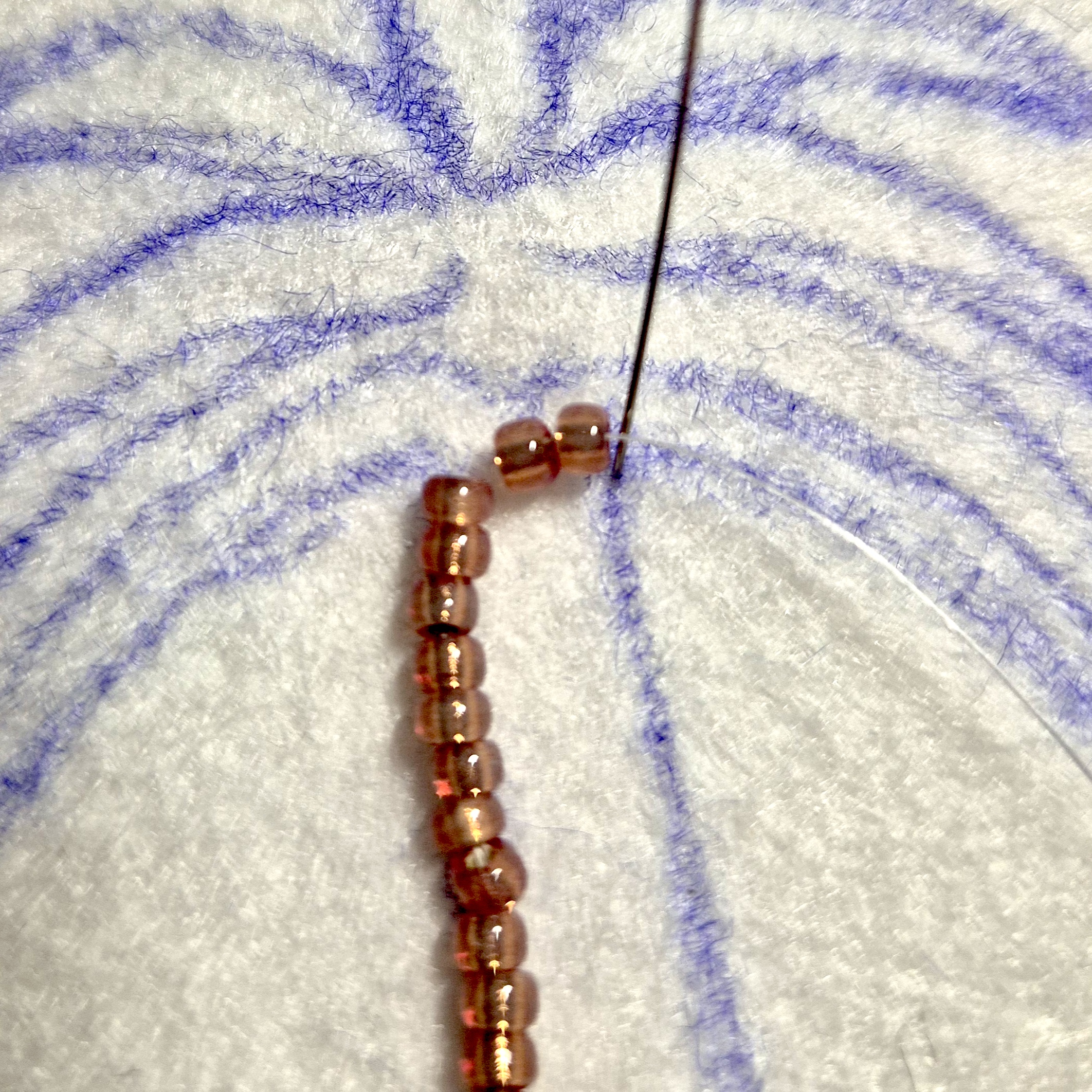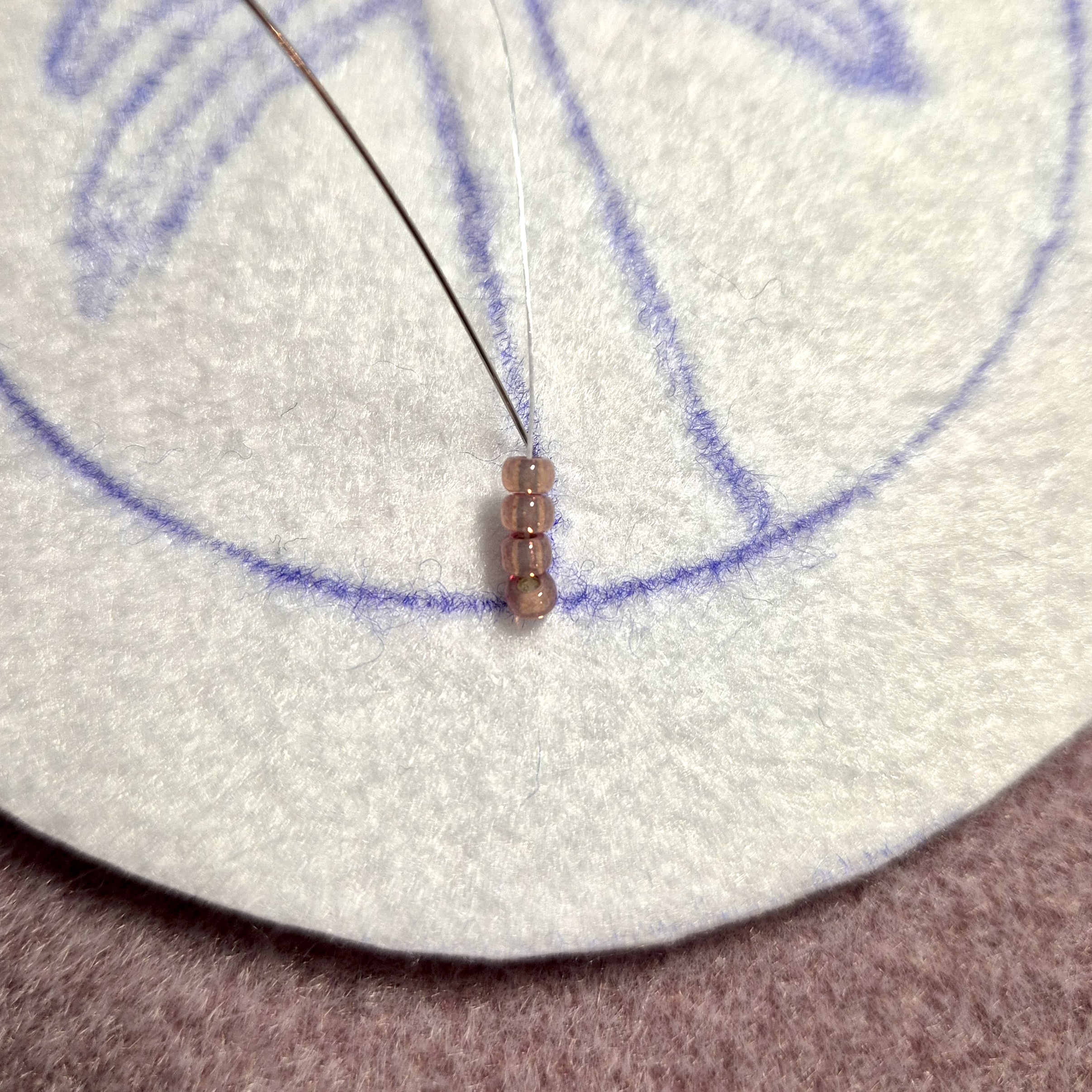 Begin dus met het rijgen van 4 kralen, leg ze plat op hun plek, en steek de naald precies achter de laatste kraal door de foundation. Als je de draad aantrekt, zie je meteen of de kralen goed liggen.