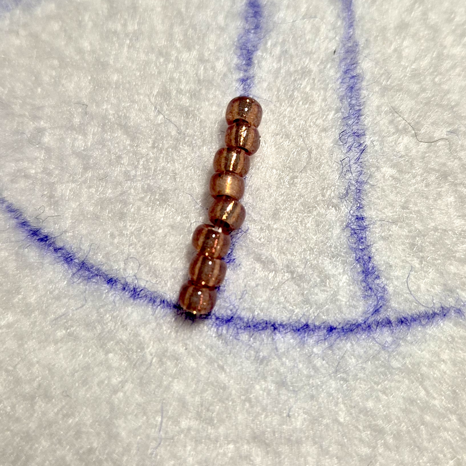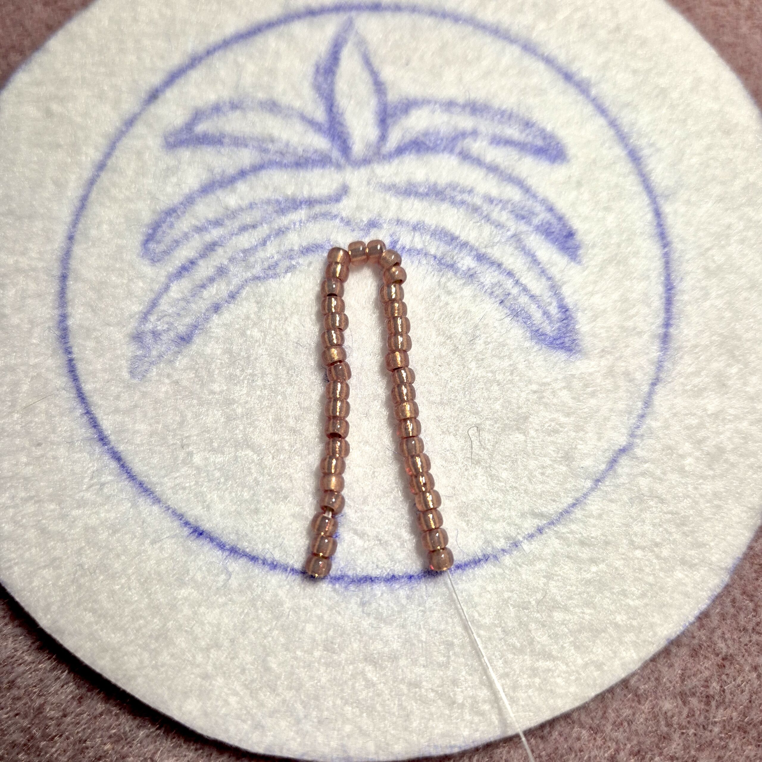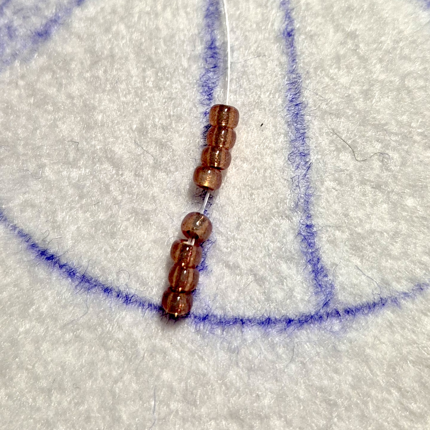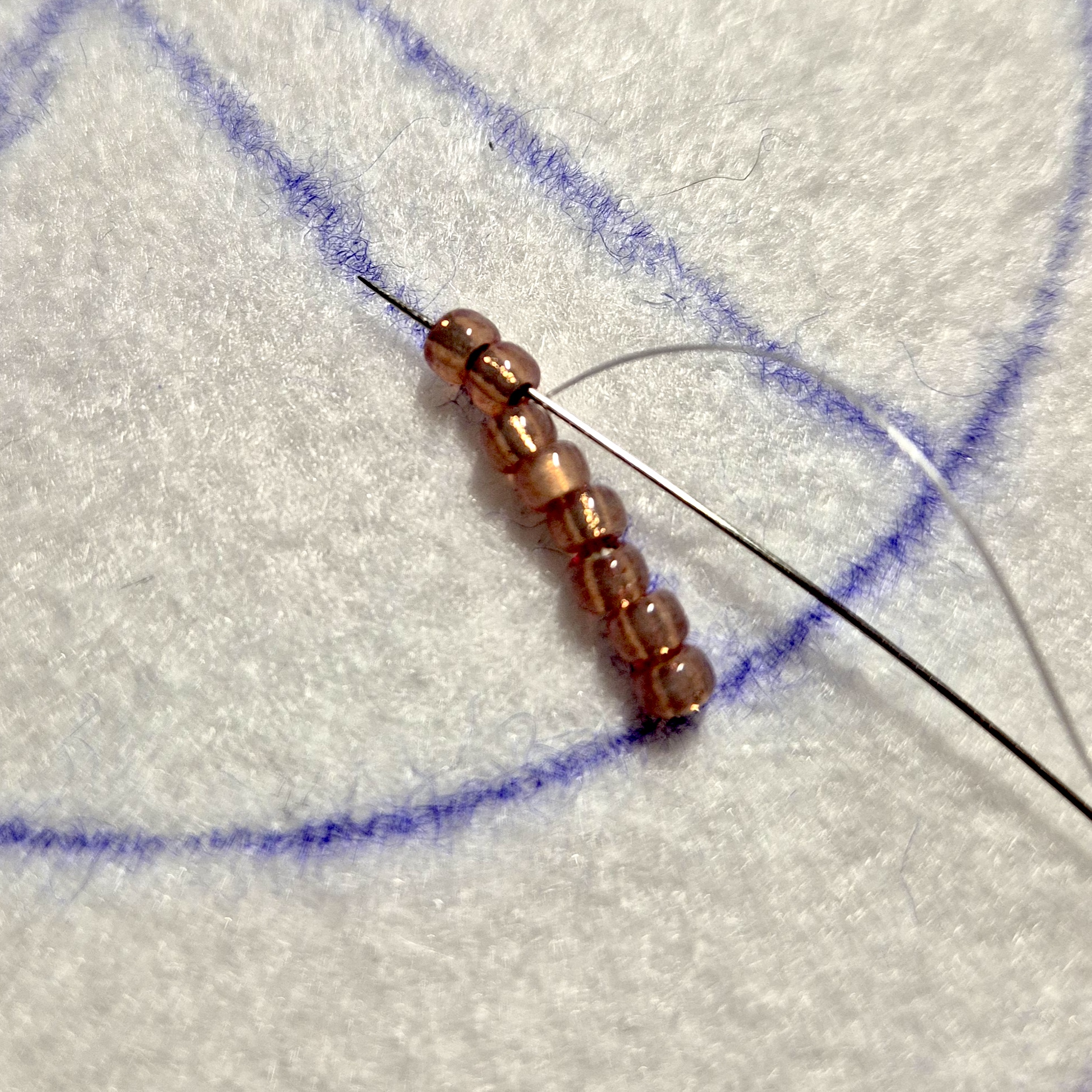 Begin dus met het rijgen van 4 kralen, leg ze plat op hun plek, en steek de naald precies achter de laatste kraal door de foundation. Als je de draad aantrekt, zie je meteen of de kralen goed liggen.