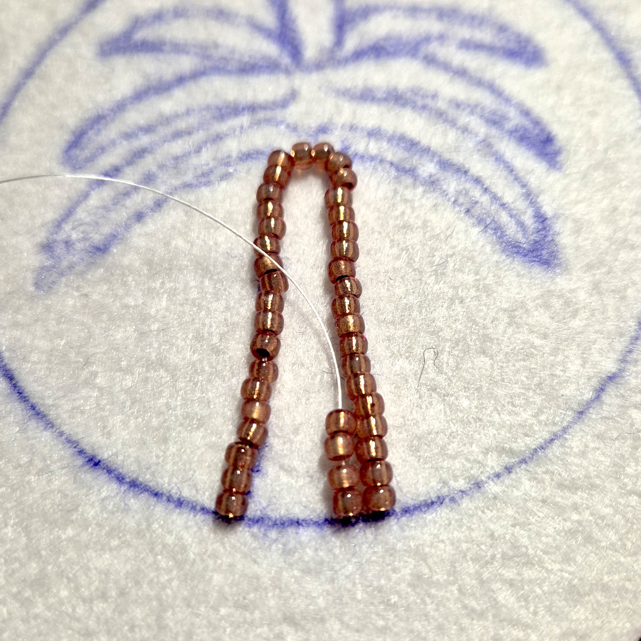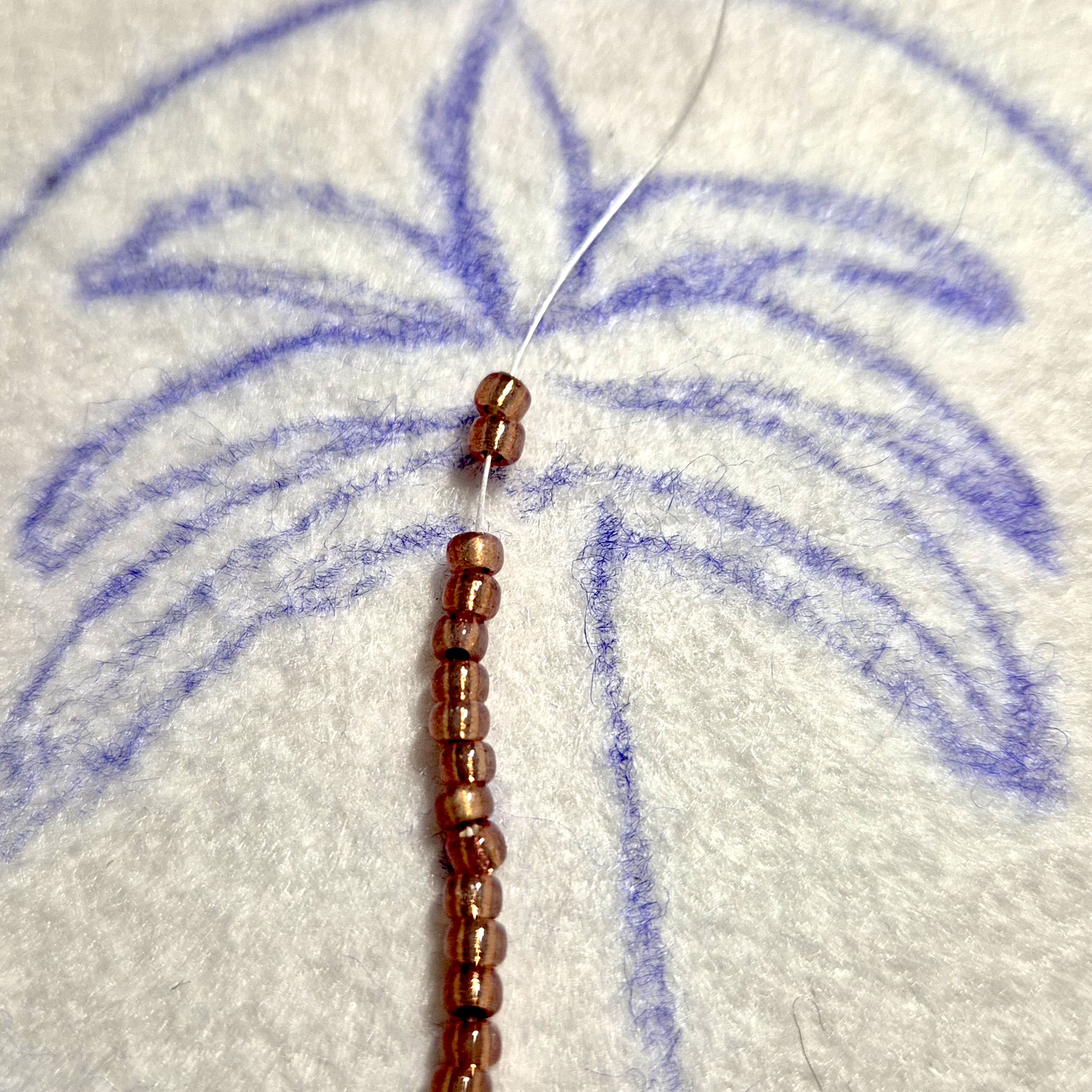 Rijg nu weer terug naar boven en zorg ervoor dat je uitkomt waar je wilt beginnen. Je kunt zelf bepalen hoeveel kralen je per keer vast rijgt, maar om het in het begin onder de knie te krijgen, raad ik aan om met 4 kralen per keer te beginnen.