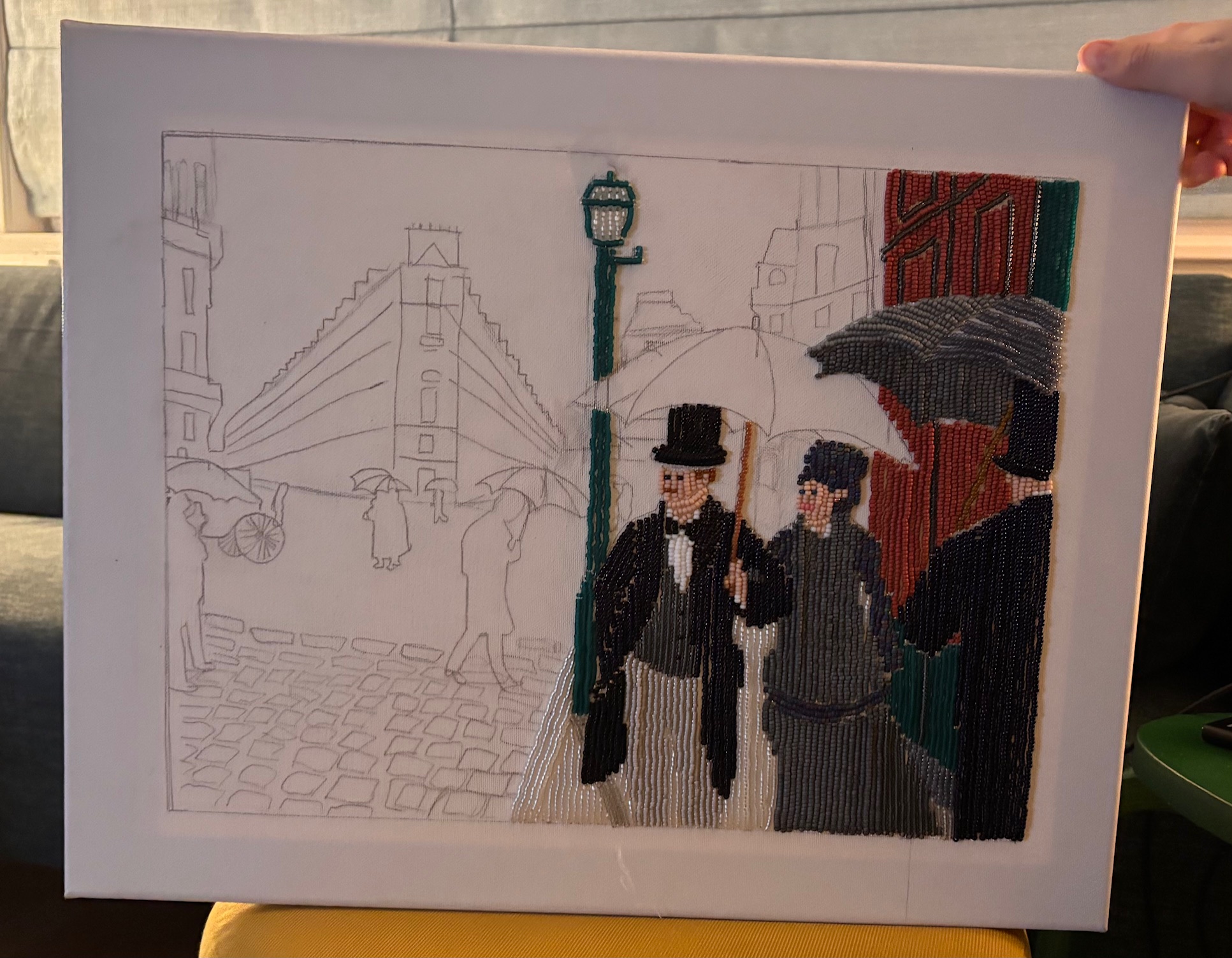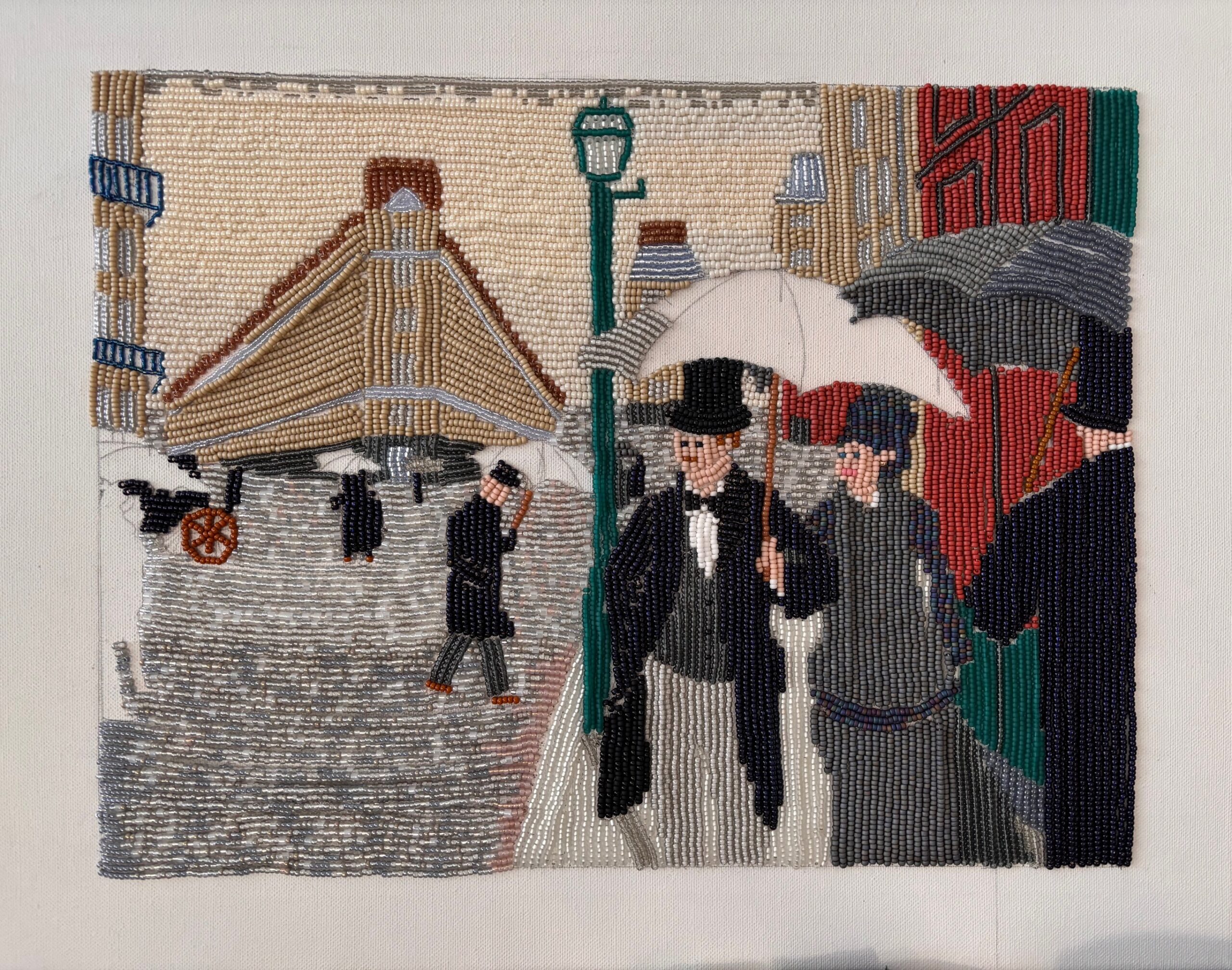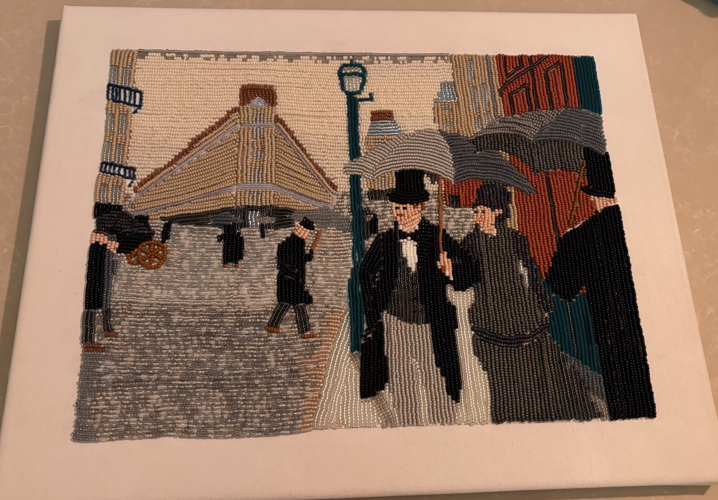 We ontvingen een email van Karin met daarin het prachtig uitgevoerde schoolopdracht “kunst in een ander jasje” van haar dochter Julia (15 jaar). Julia heeft het schilderij Paris Street, Rainy Day als inspiratiebron gebruikt en omgetoverd tot een Miyuki kralen versie. We vinden het bijzonder mooi en creatief bedacht, en we delen dit soort schitterende kunstwerken graag met jullie!